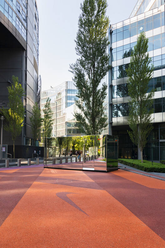 空间叙事的镜面隐喻与融入:项目最精妙之处在于其全镜面化的永久展馆设计。这种设计手法不仅创造了强烈的视觉冲击力,更重要的是,它将使用体验者置于场地核心,同时使建筑主体“消失”于周围环境之中,实现了与标志性索尼中心环境的无缝对话。这种“在场而又隐形”的设计哲学,结合使用回收材料(Nike Grind)的环保考量,为繁华的城市中心营造出一种“惊喜感”和内在的吸引力,引导公众自然地亲近和参与。