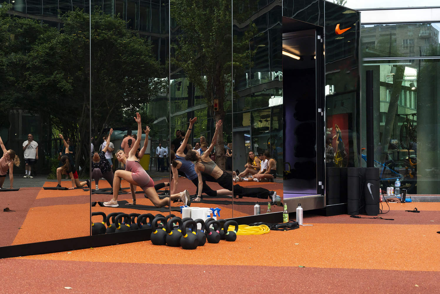 The Nike Grind floor is made from waste and recycled old shoes: outsole rubber, laminated foam, and upper materials. The mirrored pavilion places those who exercise in the center of the venue, while the pavilion itself blends completely into the surrounding environment. The carefully curated concept creates a sense of surprise in this bustling urban setting, naturally drawing people closer to movement.