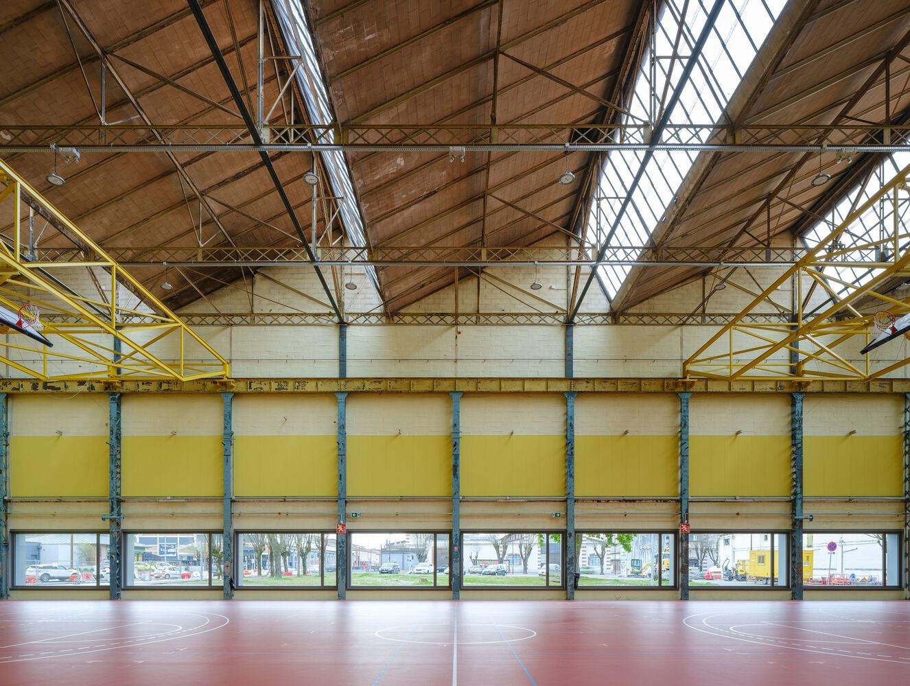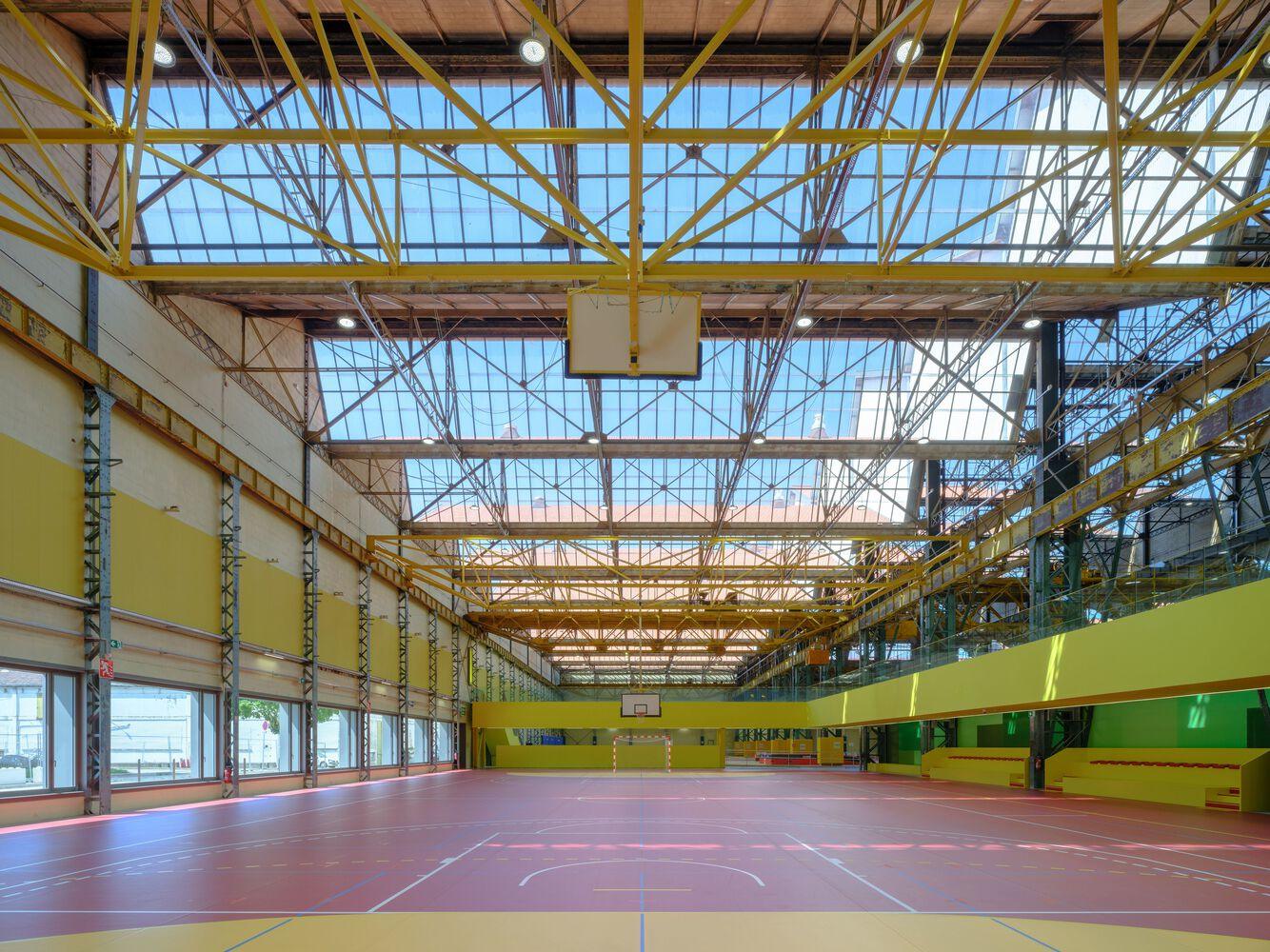 轻盈与动感的色彩策略:为了与建筑的庄重感形成对比并呼应体育活动的本质,设计引入了“轻盈、多彩的世界”。通过在原有的灰色地面上精确划分不同运动区域(田径、篮球等)来实现色彩分层,这不仅增强了空间的可读性,也激活了地面层。更具匠心的是,新功能体量(大厅、更衣室等)被设计成一个悬浮的、强烈的黄色体块,它利用了原有的桥式起重机结构,实现了“失重”的视觉效果,将严肃的工业空间转变为充满活力和游戏性的体育场景。
