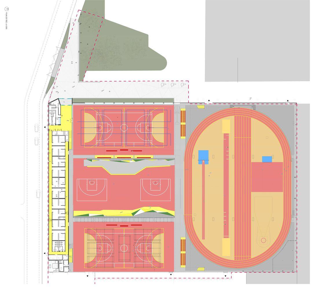 Our proposal aims to maintain the existing values while fully preserving the perception of its original characteristics, even introducing a new, light, and colorful world related to the playful character that a building of this type should express. On one hand, we intervene on the floor, which until now was gray, using color to define the new sports areas: athletics, basketball, handball, badminton, and climbing.