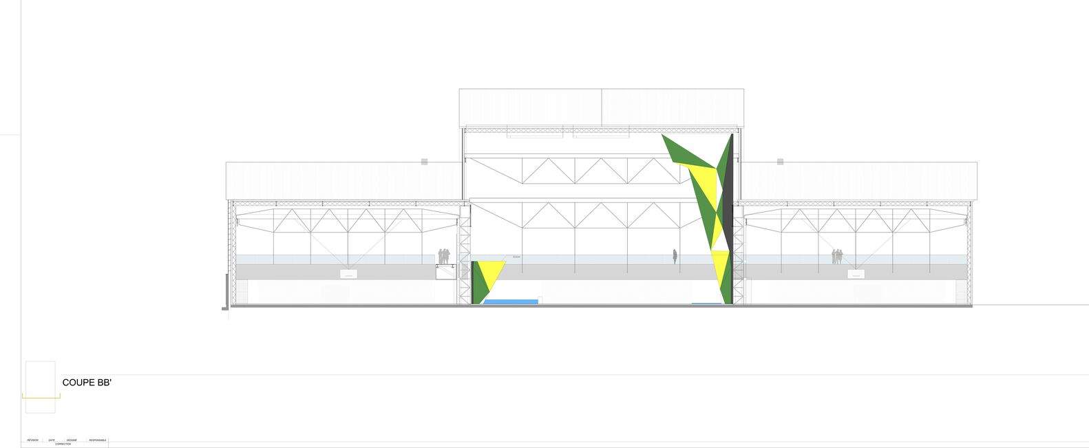 另一方面,新的体育项目(大厅、更衣室、联合会室、办公室)的要求用一个强烈的黄色块来解决,它又形成了两个大型的攀岩墙,成为项目中心空间的主角。它是失重的,漂浮在工业大教堂的空间中,这要归功于它被嵌入建筑的大柱子中,并悬挂在原有的桥式起重机上,从而赋予它们新的生命。这个作品也成为观众处于的上层,并成为界定不同运动区之间界限的元素。