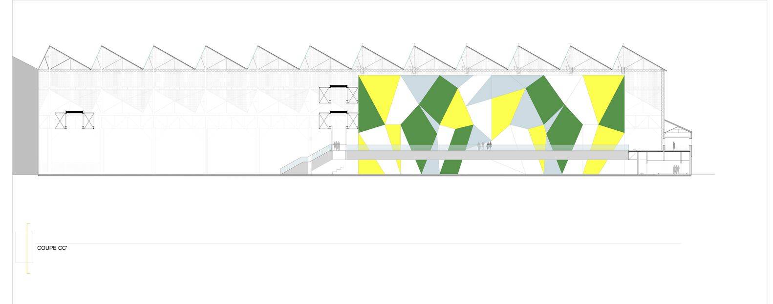 该建筑呈南北走向,长 125 米,宽 85 米,分为一个 20 米高的中央建筑和两个 13 米高的侧楼。 这些建筑具有清晰而重复的几何形状和锯齿形的屋顶,模仿了大教堂的高贵气质,尽管其外观非常糟糕,但这是时间的流逝、人的忽视和没有外墙覆盖的结果。这种贵族气质在内部得到了证实,这要归功于多色结构的表现力,虽然被时间的流逝所磨损,但它以壮观的天顶光穿透 50%的表面,决定了空间的特征。