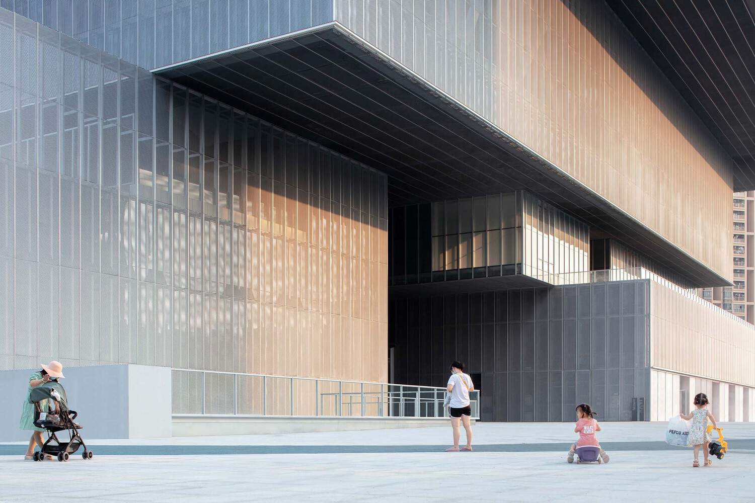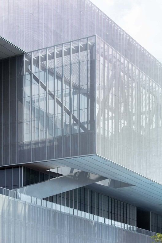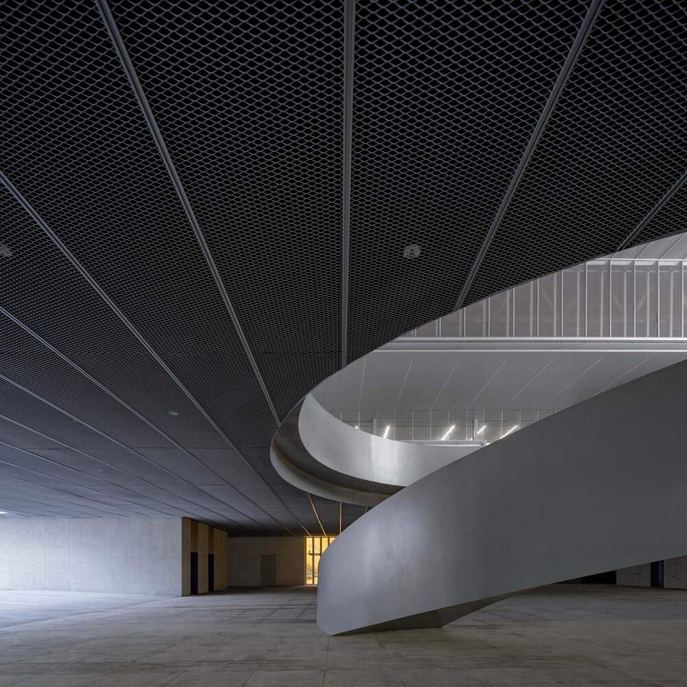 The building facade is integrated with the structure through clear and affirmative relationships in geometry, construction connections, and material properties. The facade employs a double-skin approach: an outer layer of expanded aluminum mesh and an inner layer of Low-E ultra-clear enameled glass. The outer aluminum mesh extends from the wall surface to the outdoor ceiling, defining a simple and complete sense of volume. Due to the semi-transparency and directional nature of the aluminum mesh itself, there are subtle variations in light, darkness, and transparency under different viewing angles, times of day, and weather conditions. This change in surface texture dissolves the oppressive feeling brought by the massive volume of the building. The double-skin system ensures sufficient indoor light while effectively preventing glare. As envisioned by the architects, this is intended to be an energy-efficient gymnasium that fully utilizes natural light and ventilation, effectively reducing lighting and air-conditioning energy consumption during operation and saving investment.