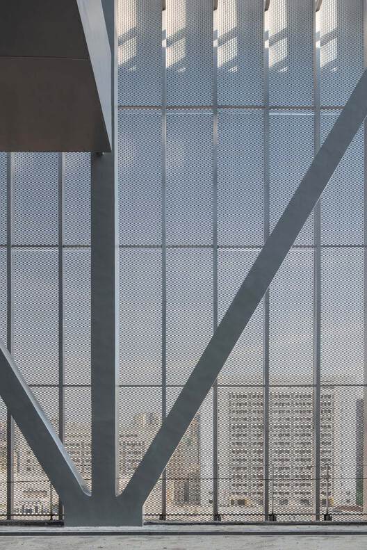 结构与表皮的逻辑统一与轻盈表达:本项目在结构、表皮和内部空间尺度上实现了高度的模数化和系统性统一。主体结构采用钢筋混凝土筒体和钢桁架体系,支撑起复杂的错位悬挑,同时结构自身的杆件体系消解了庞大体量带来的笨重感,营造出一种漂浮的轻盈感。双层表皮(铝拉板网与Low-E玻璃)不仅在美学上赋予了建筑动态变化,更在节能环保方面起到了关键作用,体现了设计深度和对建造细度的精准控制。