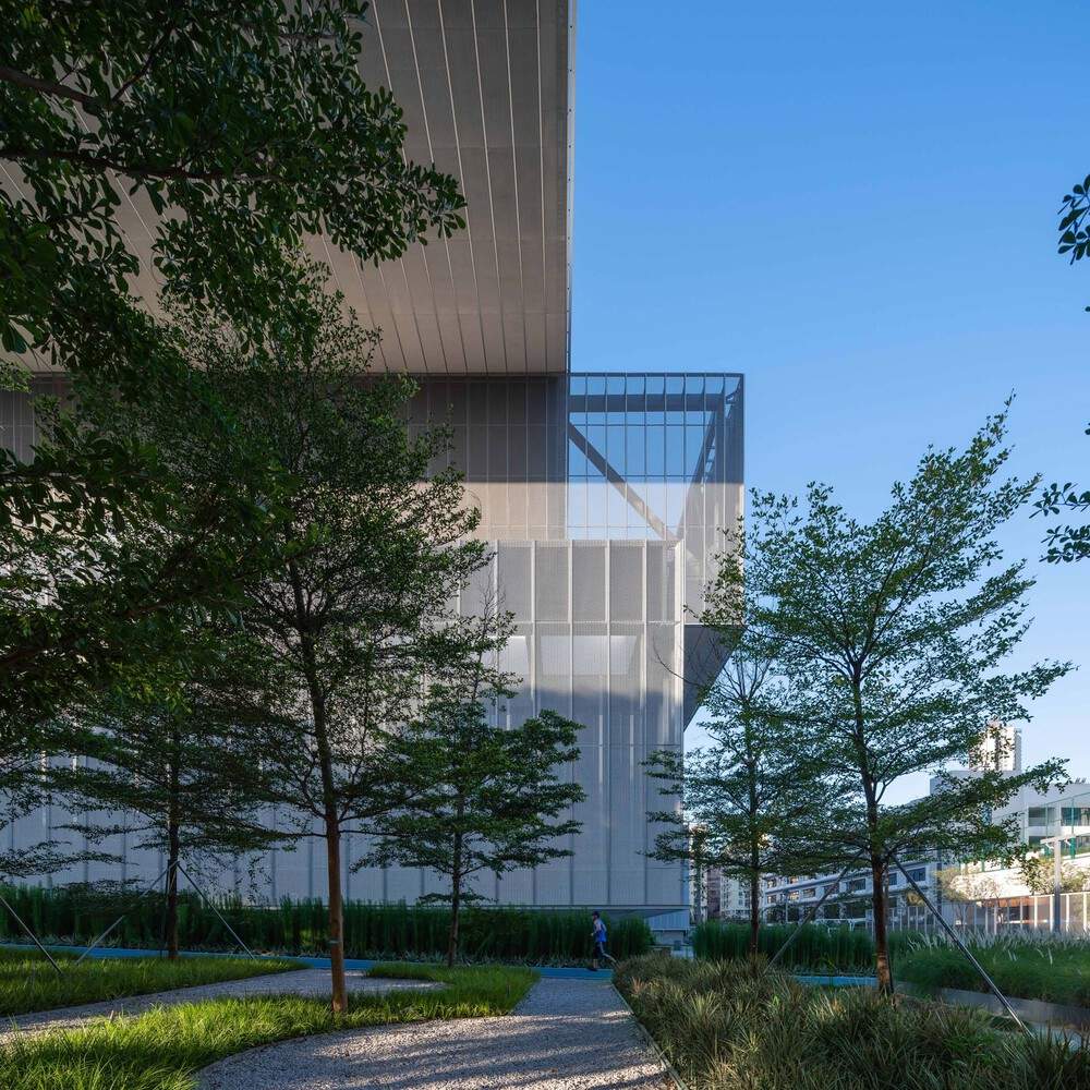 走近看,建筑多孔性的特征渐趋明显。在建筑底部,贯通南北的开敞门厅吸引市民自由出入。在其上各层,均有露台、花园、架空休憩空间植入。楼梯上下连接,并与地面广场相接,鼓励市民在闭馆之后继续使用这些开放空间。