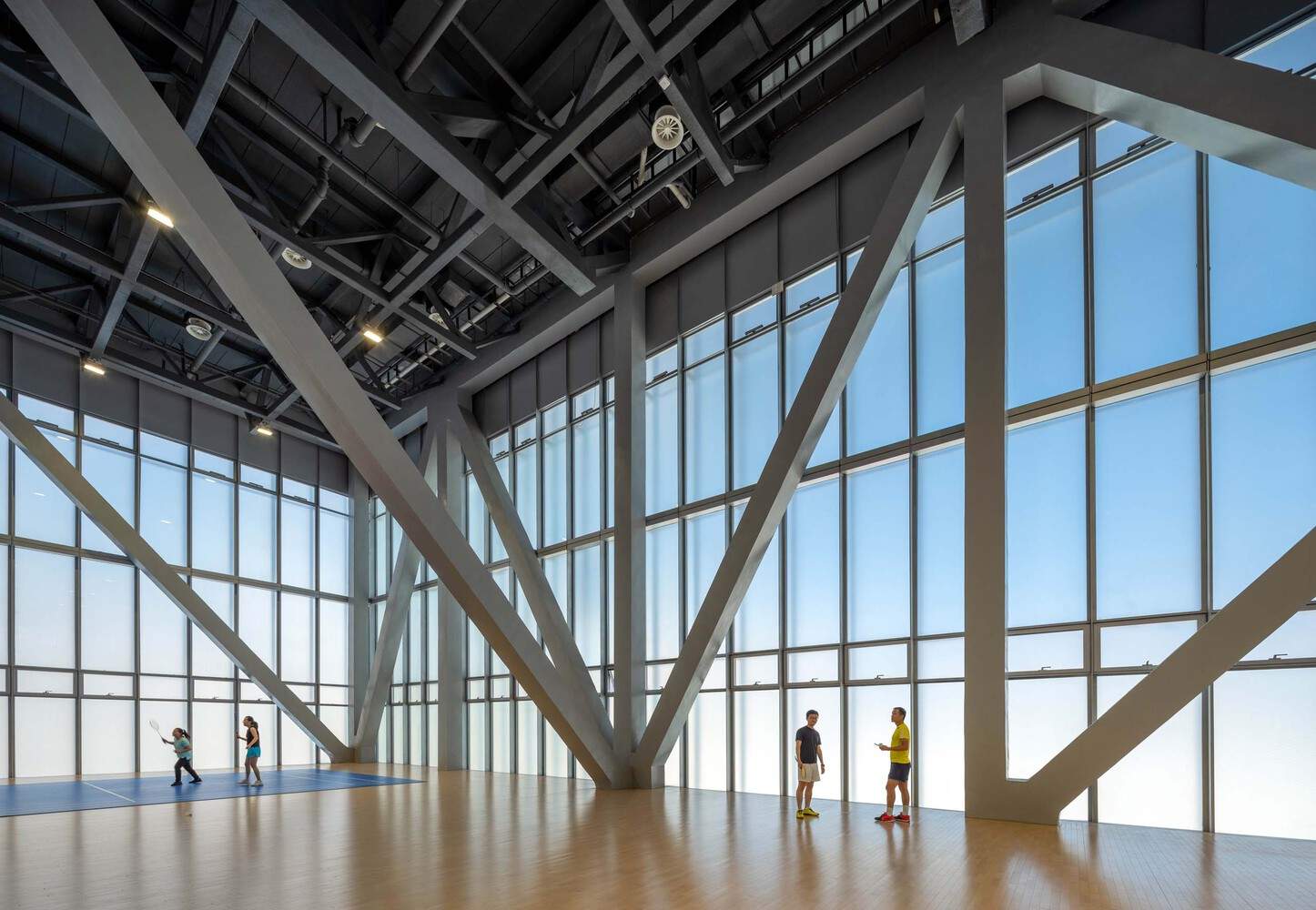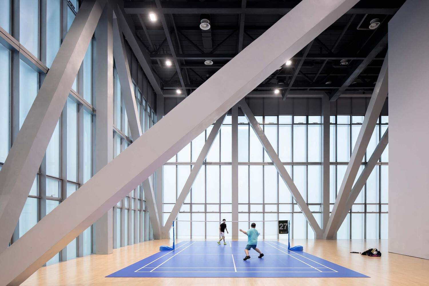 大部分室内场馆反映出朴素的工业美感。这既是对成本限制的呼应,更是“返璞归真”的主观愿望牵引,剔除一些可有可无的装修,做到少费而多用,回到为运动创造空间的本质。简上体育综合体是CCDI境工作室所有主持设计的项目之中难度系数最大、覆盖范围最广、控制深度最高的一个项目。如果以文学写作类比,简上体育综合体的创作相当于写一部长篇小说。在长达五年六个月的持久战中,我们监督绘制了数千张技术图纸,数百次深入工地查看进度及质量,数十次参与各种技术、管理协调会议。除了建筑专业的工作之外,我们还进行了室内、景观、幕墙、标识、灯光等专业的设计,并对其余近40个相关专业的设计工作进行监督审核和统筹协调。