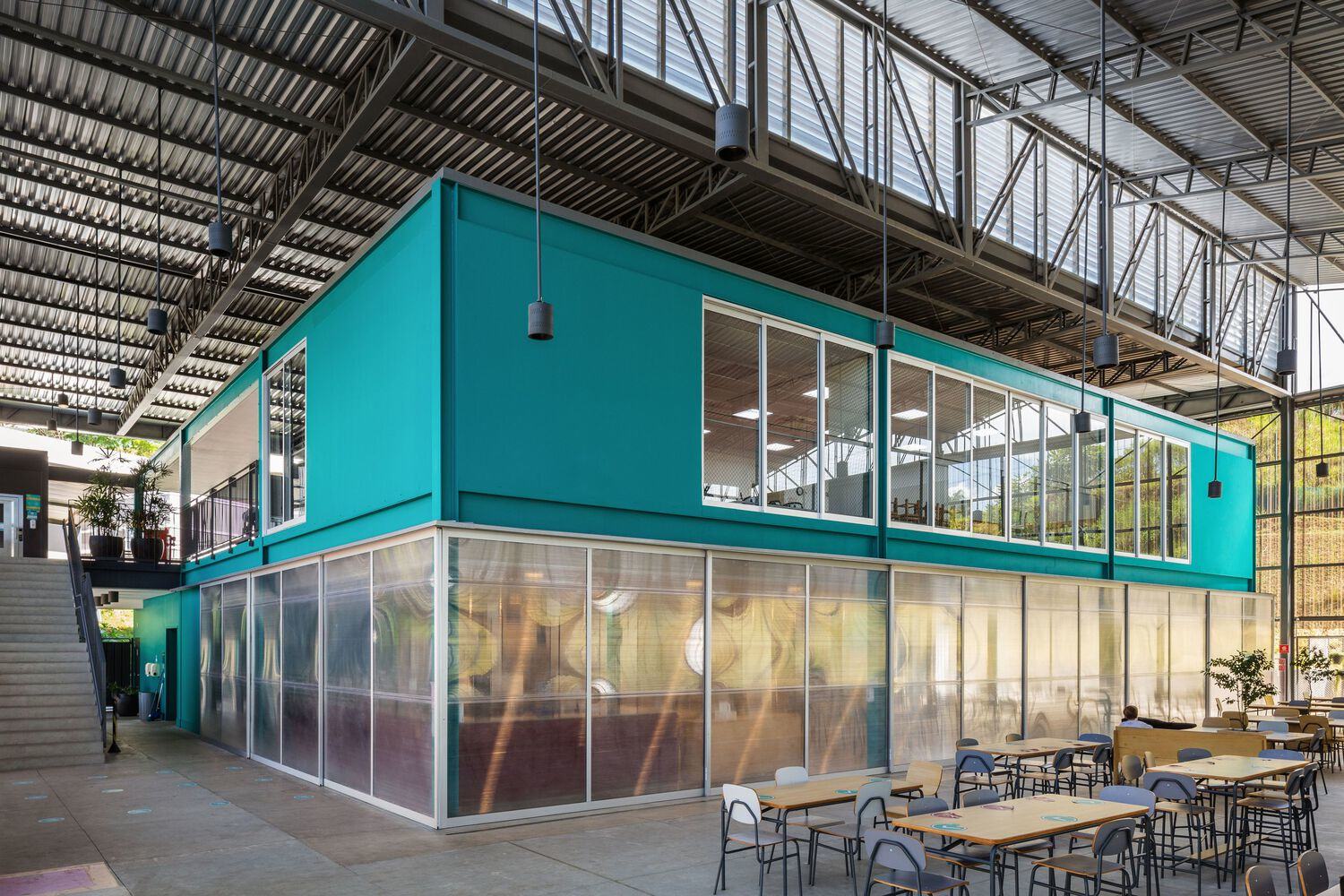 The canopy roof in front of the building is made of honeycomb polycarbonate panels, which, combined with polycarbonate blinds, form a good ventilation system. Furthermore, the internal space of the Castanheiras Arena is mainly composed of a metal structure and a steel deck slab, allowing it to better adapt to the microclimate of the surrounding environment. The arena's floor plans also include restrooms, a restaurant, and a kitchen, with the top floor housing art and cinema classrooms, as well as a theater.