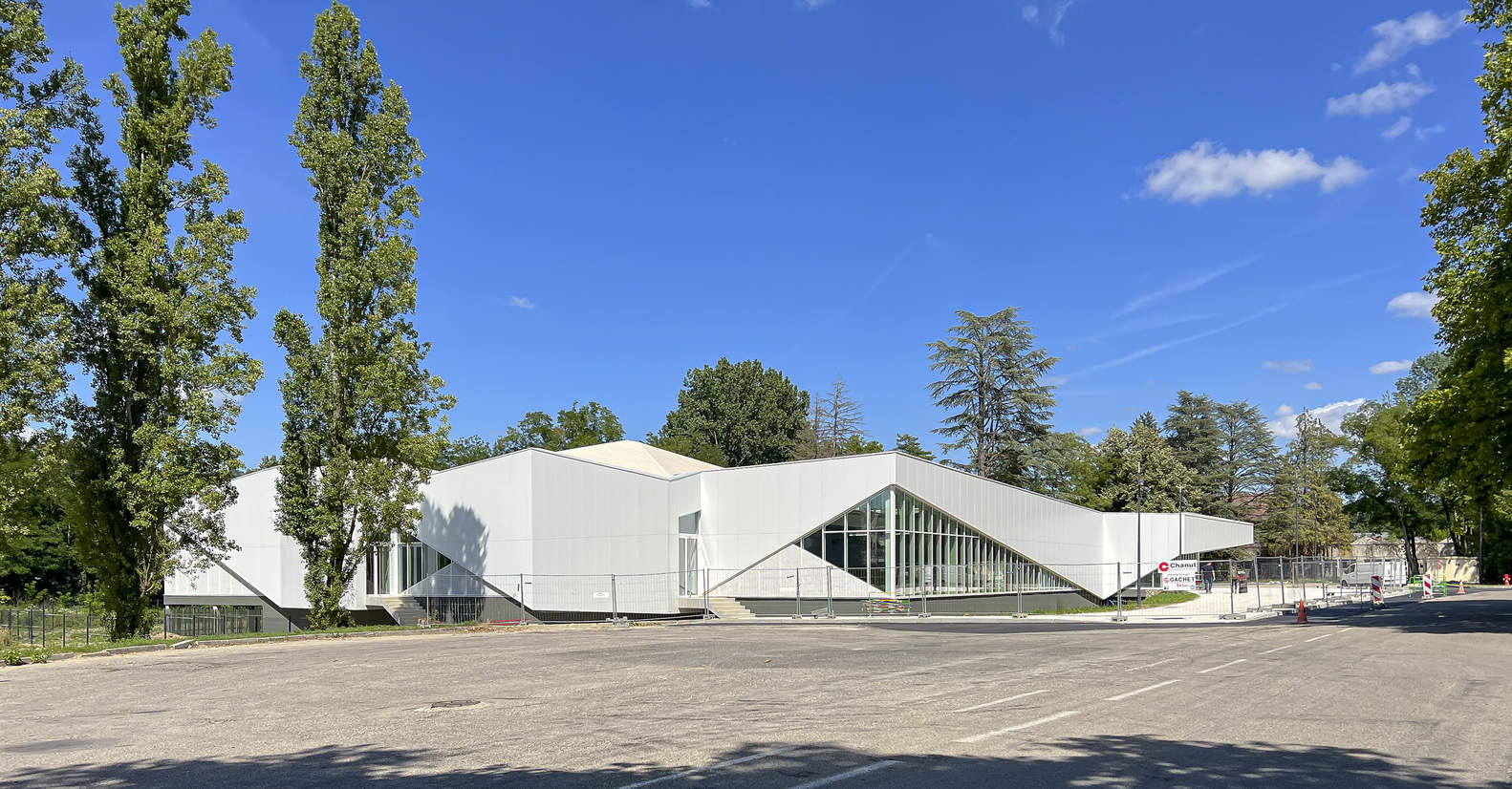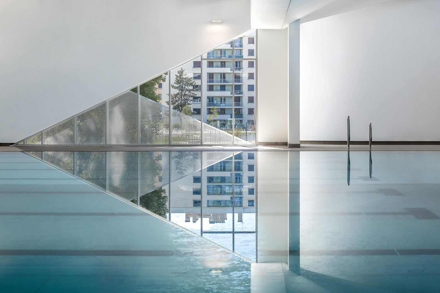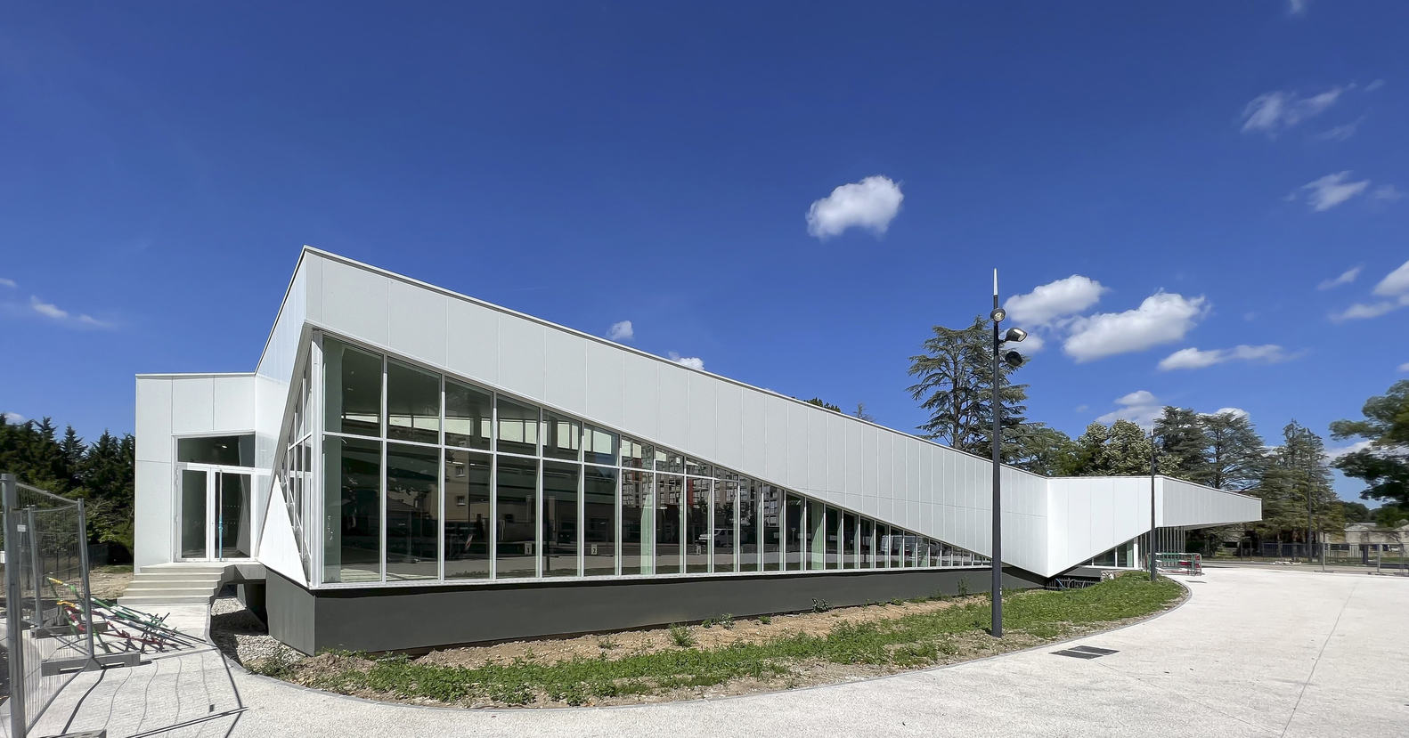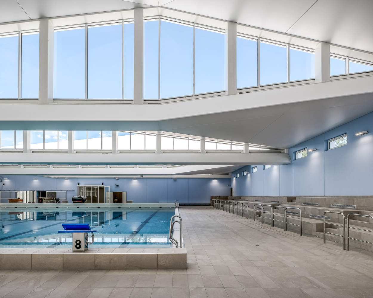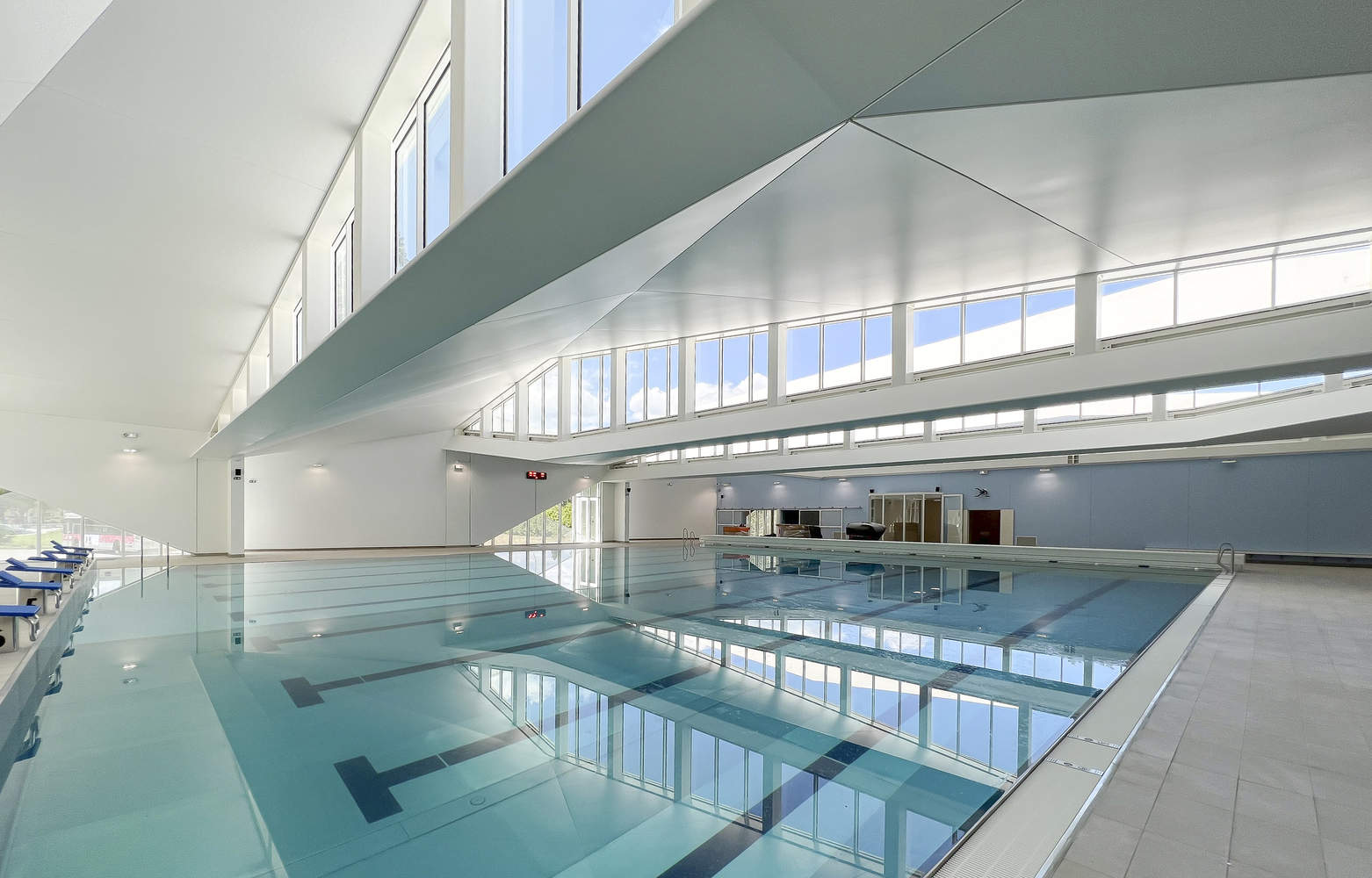 The facility is located on the western side of the site, and the entrance immediately reveals the widest part of the project: the swimming pool, through large floor-to-ceiling windows. The facility, open to the south, benefits from a large amount of light entering through the skylights. The huge sawtooth roof, arranged in staggered waves, brings uniform light to the swimming pool basin. This variable, pleated roof is also intended to improve acoustic comfort in the basin areas.