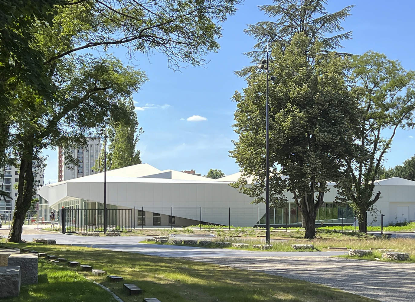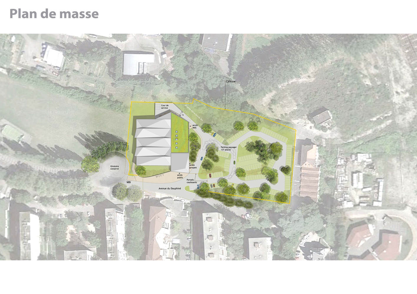 该项目将社区与多菲内 (Dauphiné) 大道的开放通道相结合。它位于洪涝地区,东边有一个停车场。由于场地需要局部净化,因此不需要分级污染土壤。除了国家森林办公室报告指定要砍伐的树木外,其他树木都得以保留。自然雨水管理景观系统包括透水停车场、沟渠和渗透盆地的交替使用,此外将设置一个约 160 平方米的光伏遮棚。