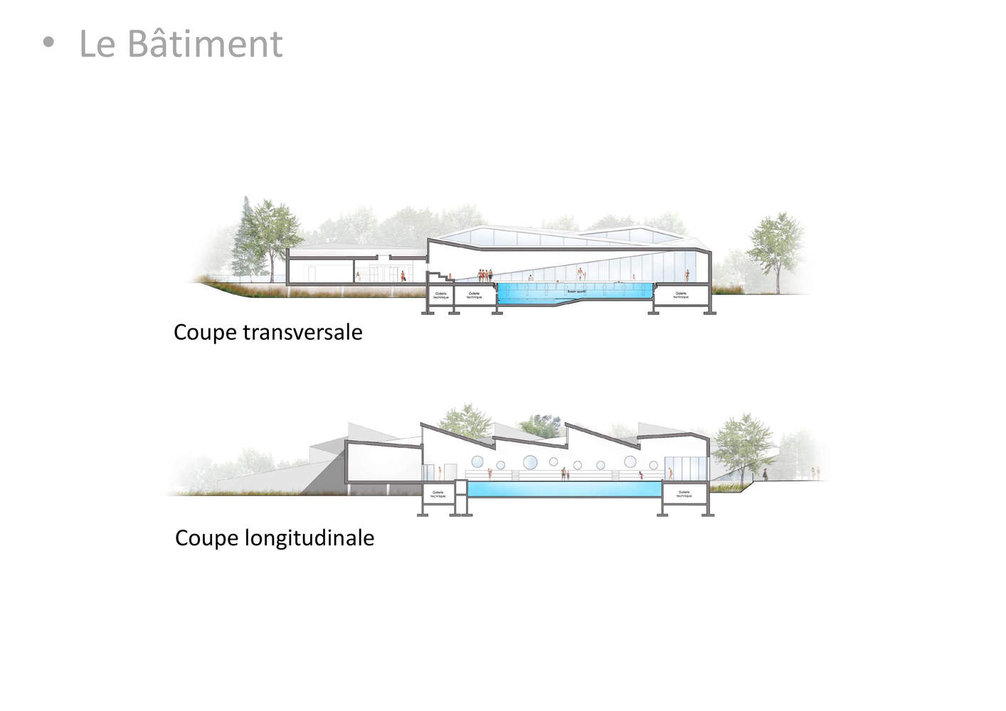 该项目目标是充分利用这个新设施,通过扩大其公共和活动能力,赋予它真正的跨社区地位。符合项目委托方 CAPI 期待的游泳池于 9 月初交付使用,是其能源转型和可持续发展政策的一部分。其目的也旨在使这个新设施成为能源转型方面的旗舰,并获得 BEPOS(正能量建筑)标签。
