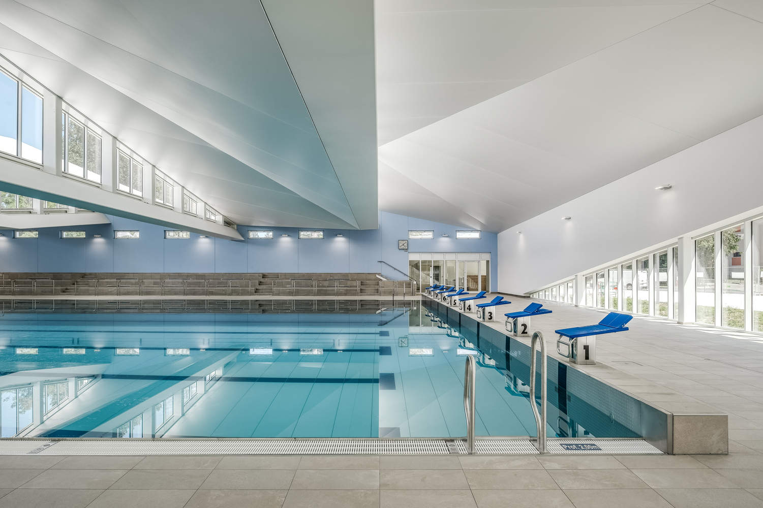 该设施位于场地的西侧,入口处迎面而来的大面积落地窗透露出项目最宽尺寸的区域:游泳池。南面开放的设施让大量的光线从天窗进入。呈交错波浪形的巨大锯齿状屋顶给游泳池游泳池带来均匀的光线。这种可变的有褶屋顶也是为了提高盆地区域的声学舒适度。
