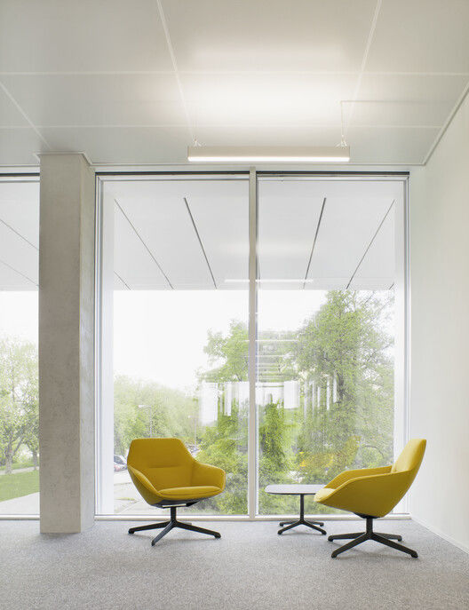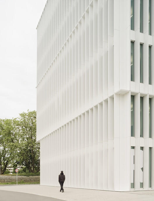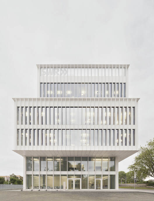 透明性、互动性与环境的深度对话:建筑的立面处理是其精髓所在。垂直铝制壁柱条分割的玻璃幕墙,保证了视觉穿透性,使广播电台的运作状态成为城市景观的一部分。同时,面向广场的一层设置了可供一窥内部的互动空间,而错落的体量也为员工创造了面向城市的观景阳台。这种内外兼修的设计哲学,不仅体现了对员工工作环境的关怀,也强化了SWR作为公共媒体机构对社会开放与连接的承诺。