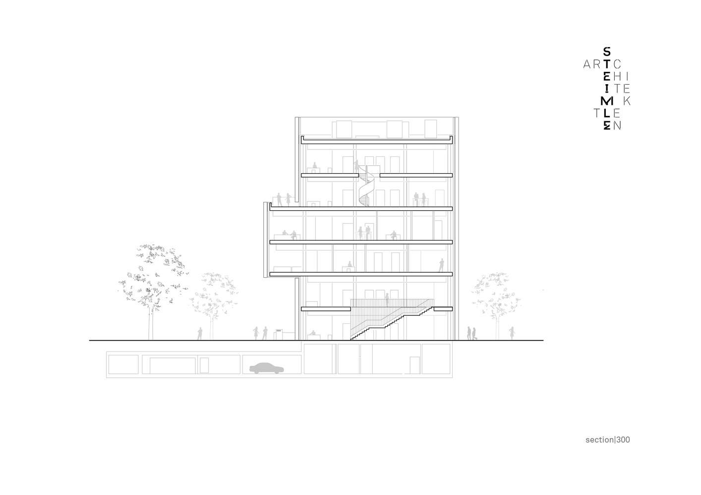 社区前的城市广场,不仅承担着连接开放空间、将社区向绿树成荫的内卡河畔敞开的城市规划功能,更被赋予了互动平台的内涵,为人们提供了一窥“广播制作”奥秘的空间。与娱乐中心(casino,此处指广播公司内部员工休闲场所)及面向广场的户外露台相结合,日常演播生活与公共空间的界限变得模糊。大楼四面环绕的玻璃幕墙,由垂直铝制壁柱条分割,既可让人一览无余地观赏广播电台日夜不息的运作,又让媒体工作者与周边环境紧密相连。