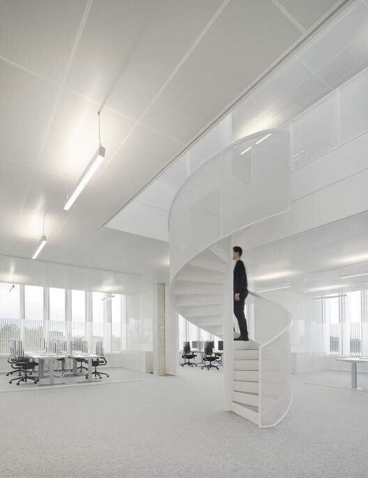 在这座共六层的建筑中,约 60 名员工负责为听众提供全面报道和最新资讯。建筑体量由跨两层的凸出与凹陷部分构成,赋予建筑雕塑般的视觉效果。