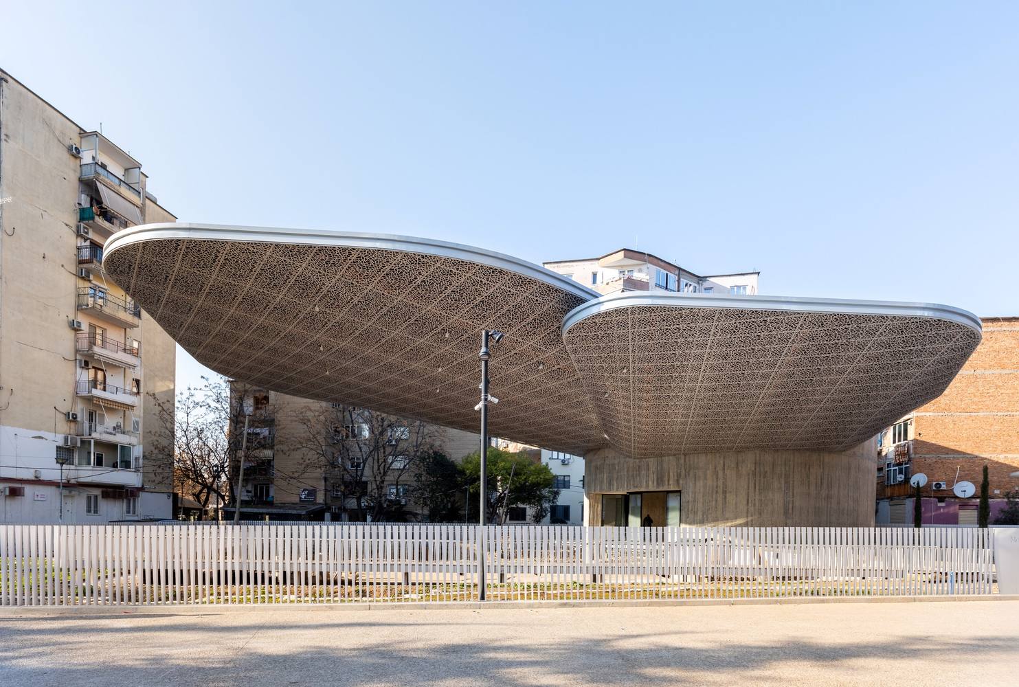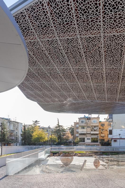 The intervention consists of three core components: the entrance ticket office, a protective canopy, and a new two-story building housing laboratories, exhibition spaces, and administrative offices. The architectural concept derives from the Tirana Mosaic itself, particularly the ancient "Flower of Life" symbol found on the site. This pattern is reinterpreted in the design, taking the form of the "petal-shaped" canopy structure that shelters the mosaic.