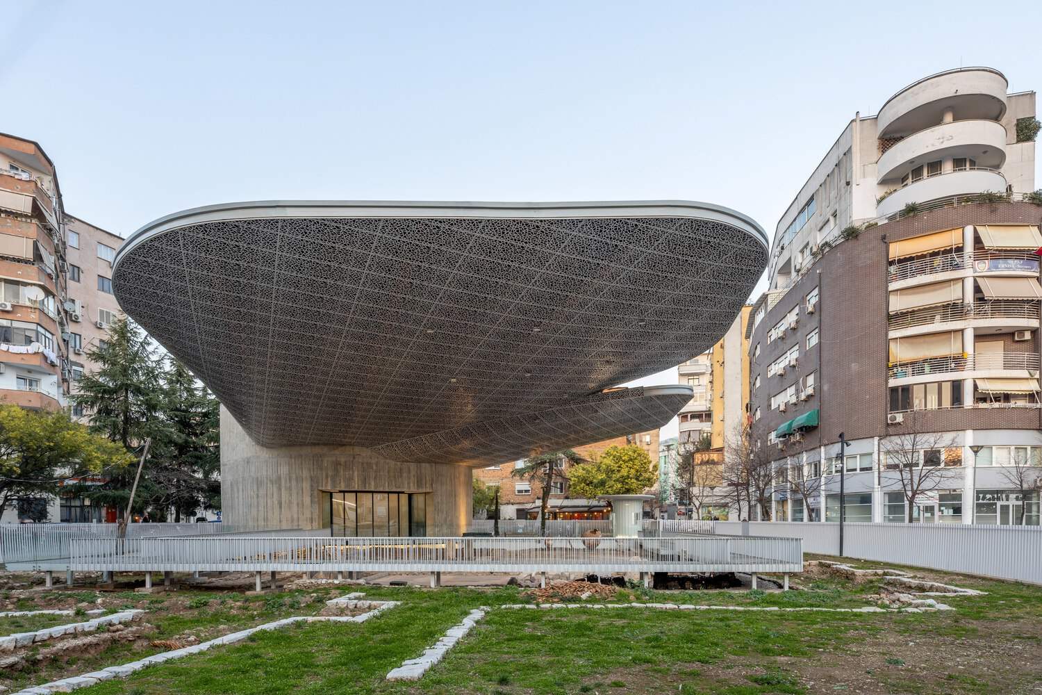 “生命之花”主题的结构性转译:项目最巧妙之处在于其建筑理念的灵感源泉——地拉那马赛克中发现的“生命之花”符号。这一符号被创造性地转化为保护性遮棚的“花瓣”状结构,实现了从文化符号到建筑形态的有机转换。这种结构不仅提供了必要的遮光和环境控制,其轻质框架和织物网罩的设计也最大程度地降低了对遗址的视觉干扰,体现了对文保项目的深刻理解。