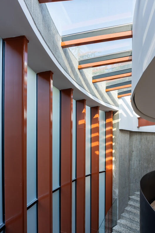 首层布局以核心公共功能为主,东北侧设置主展览空间及配套技术用房。一座放射状楼梯通达二层,此处分布着办公区域与开放式实验室。