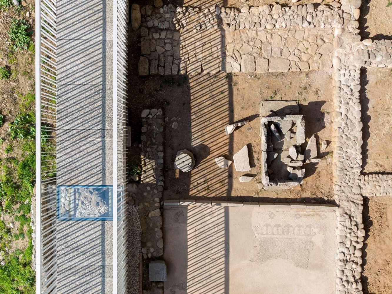该干预项目由三大核心部分构成:入口售票亭、保护性遮棚,以及一座集实验室、展览空间与行政办公于一体的新型两层建筑。其建筑理念源自地拉那马赛克本身,尤其是遗址现场发现的古老“生命之花”符号。这一图案在设计中被重新诠释,化作遮护马赛克的“花瓣”状遮棚结构。