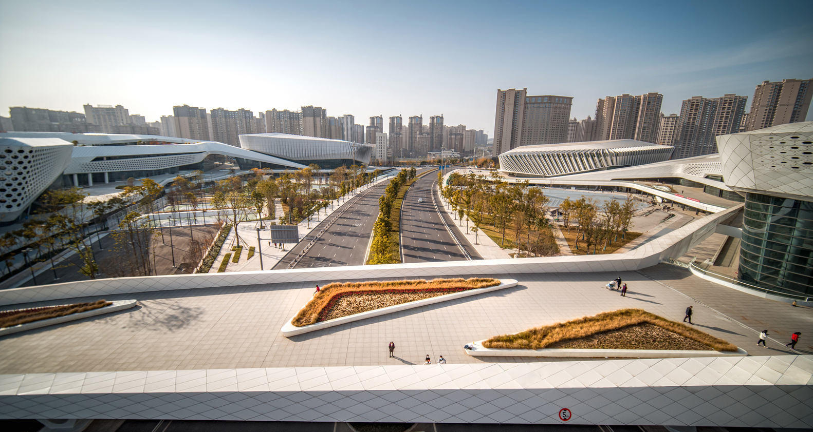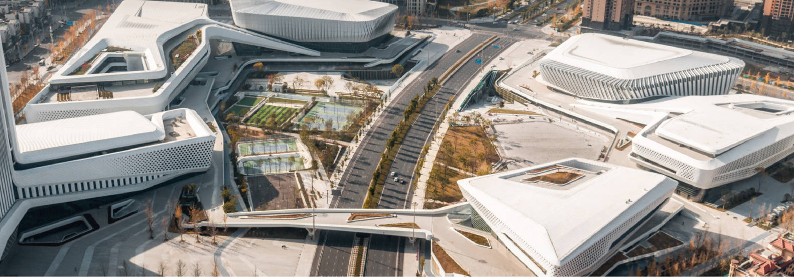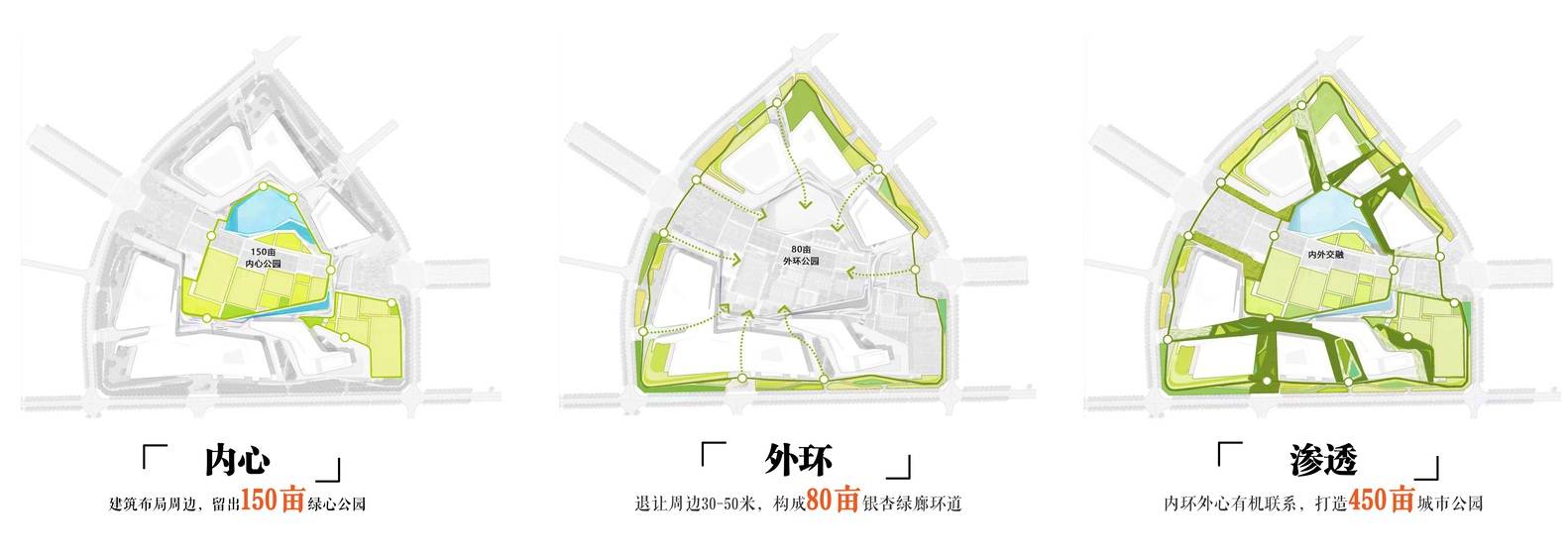 <p's multi-level park system: The building clusters enclose a 150-mu core green space, while the periphery creates an 80-mu circular landscape belt with building setbacks of 30-50 meters, featuring ginkgo corridors and fitness trails. Seven radial landscape corridors connect the inner and outer rings, integrating to form a 450-mu central sports park for the city, establishing a complete green space system for the central urban area. Through a multi-elevation greening system comprising ground landscaping, a 1.2-kilometer elevated vitality ring at the 6-meter elevation, and a 3000 square meter rooftop garden, a continuous and three-dimensional park system is constructed, organically merging architecture with nature to create an unbounded immersive ecological space. Various elevation levels interpenetrate, forming a richly layered three-dimensional park experience.