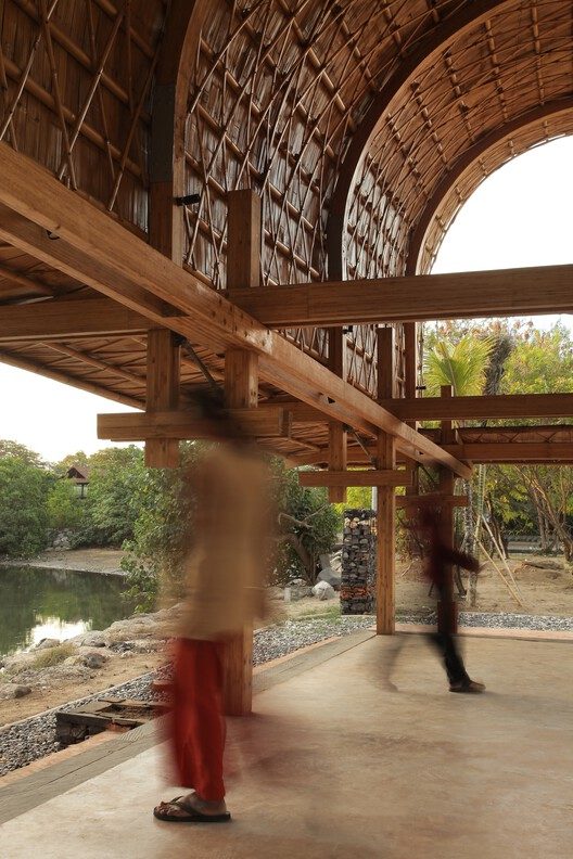 The pavilion was realized through the collaboration of Cave Urban, Bauhaus Earth, Bamboo Village Trust, Atelier One structural engineers, Eco Mantra, Kota Kita, Indobamboo, and students from the University of Warmadewa, with participation from local artisans. Prefabricated components were transported to the site and bolted together, showcasing a rapid, low-impact construction methodology. "It was astonishing to see the pavilion rise in just a few days using a construction method similar to engineered timber framing."