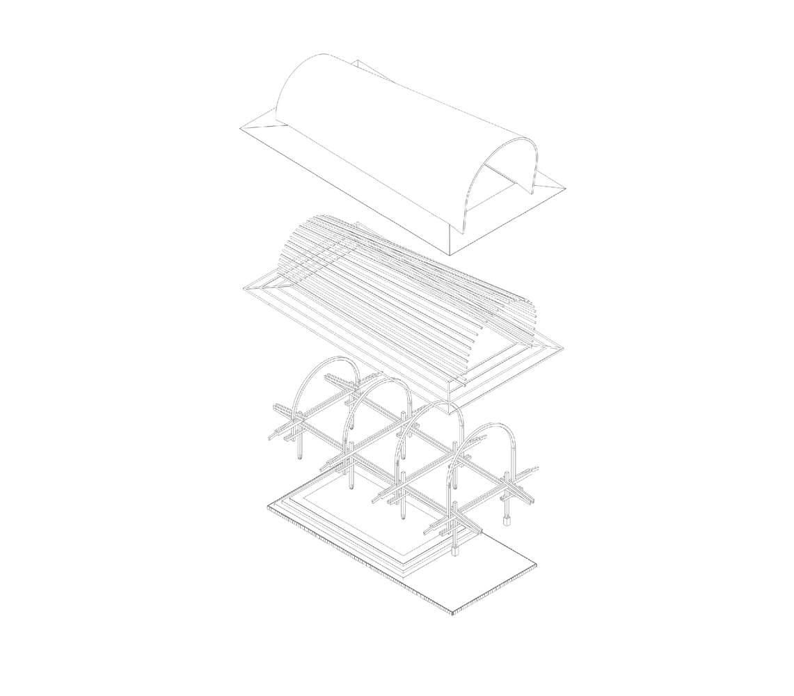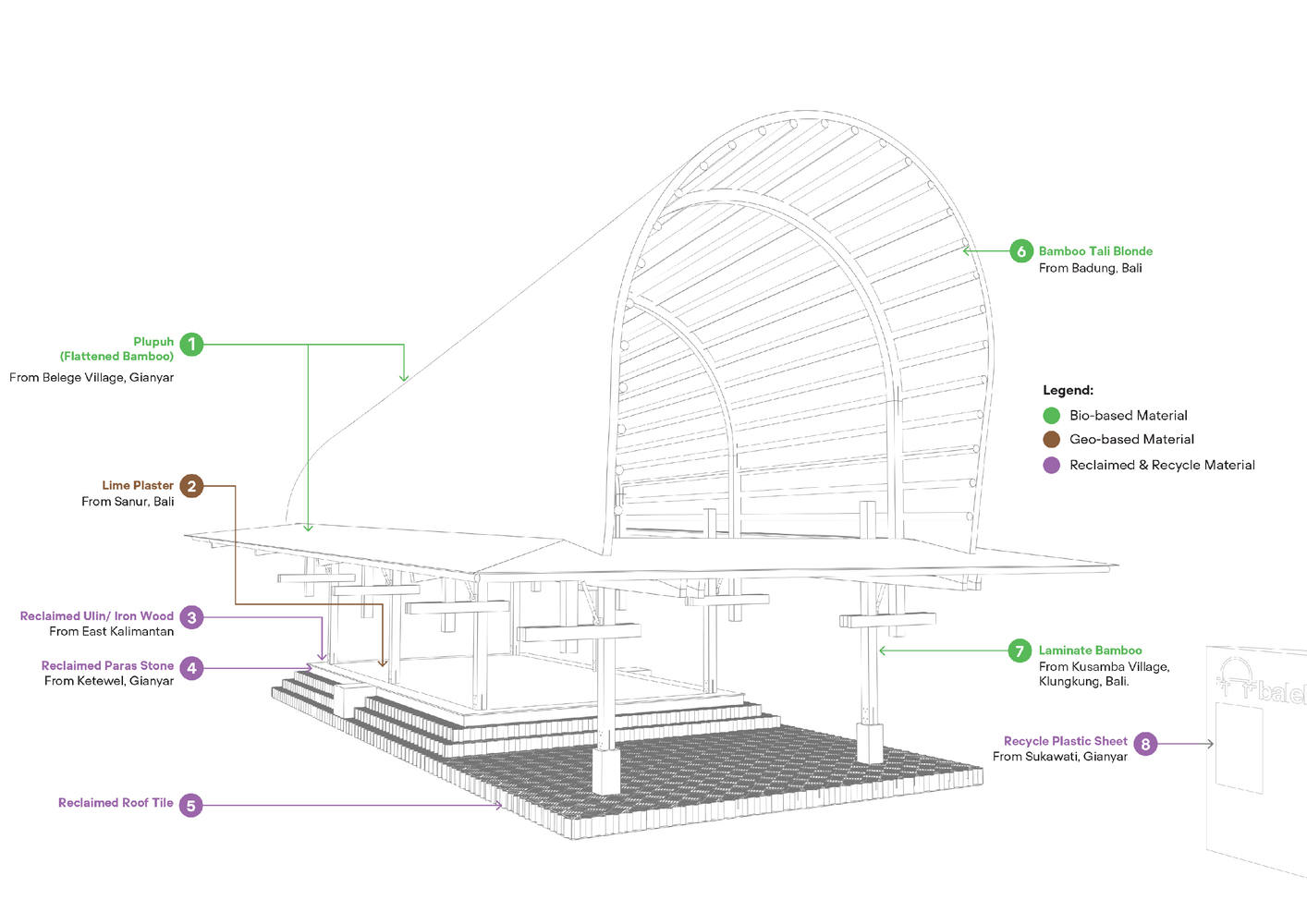 The pavilion is formed by three arched laminated bamboo trusses, each spanning 4 meters, rising to a height of 8.5 meters from a plinth constructed of recycled temple stone. The open, elevated floor plan continues the expansive character of the traditional Bale Banjar, while the prefabricated bolted connection system ensures rapid assembly and long-term stability in the tropical climate. The arched roof profile takes inspiration from the Lumbung (rice barn), paying homage to both agricultural architecture and coastal shipbuilding traditions, merging inland and marine vernaculars into one fluid structure.