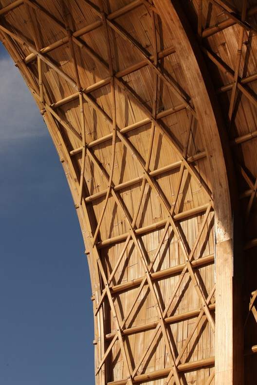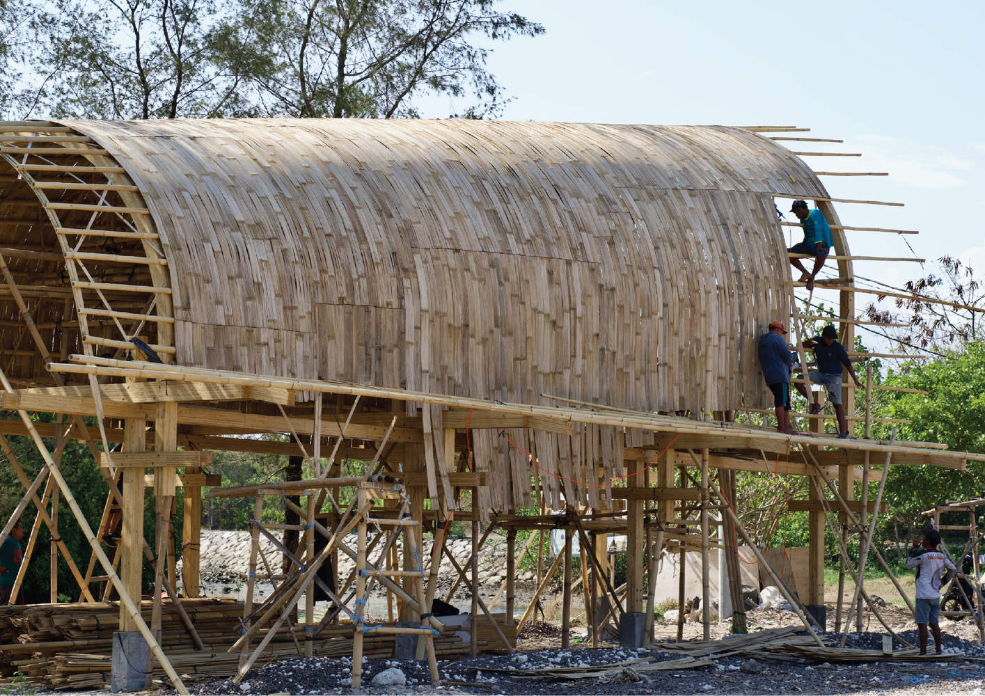 该展馆由 Cave Urban、包豪斯地球(Bauhaus Earth)、竹村信托(Bamboo Village Trust)、Atelier One 结构工程事务所、生态曼陀罗(Eco Mantra)、科塔基塔(Kota Kita)、印尼竹材公司(Indobamboo)以及瓦玛德瓦大学(University of Warmadewa)的学生共同协作完成,并得到当地工匠的参与。预制构件被运送至现场后通过螺栓拼接成型,展现了快速、低环境影响的建造模式。“短短数日内,展馆便以近似工程木构的建造方法拔地而起,这一过程着实令人惊叹。”