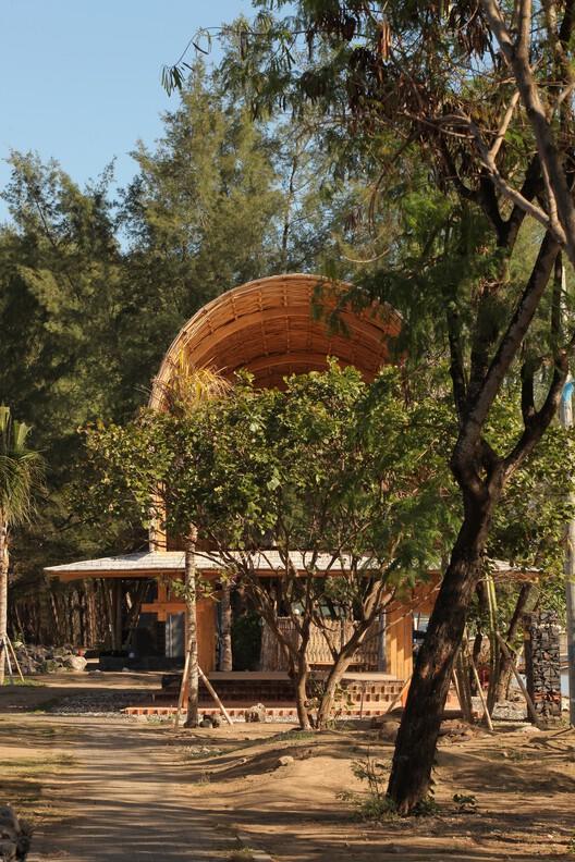 展馆由三道弧形层压竹拱构成,每道跨度 4 米,整体结构从由回收寺庙石材搭建的基座上拔地而起,高达 8.5 米。开放式、抬高的平面布局延续了传统巴莱班贾的开阔特质,而预制螺栓连接系统则确保了热带气候下的快速组装与长期稳定性。屋顶的拱形轮廓借鉴了粮仓(Lumbung)的形态,向农耕建筑与沿海造船传统致敬,将内陆与海洋的本土建筑语言融于一脉流畅的结构之中。