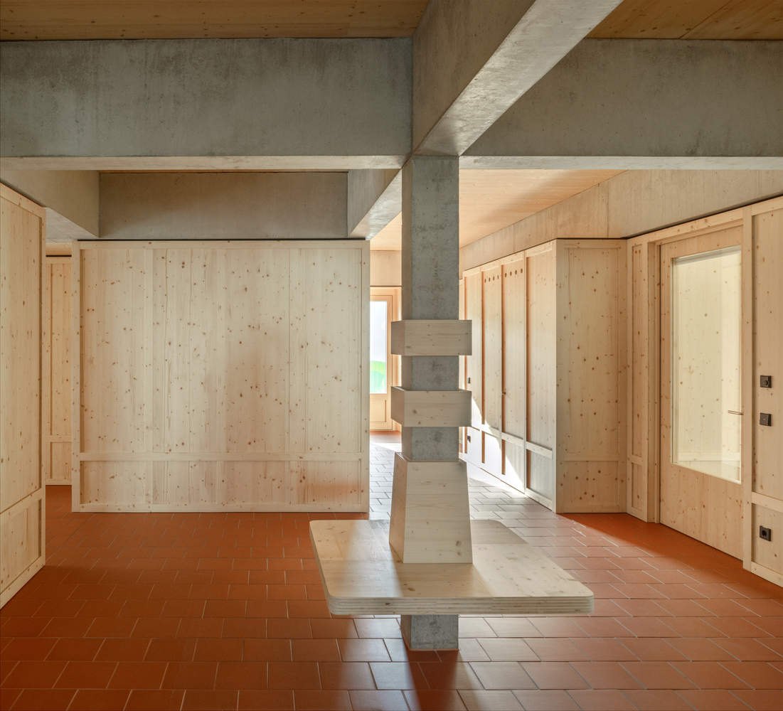 The building structure consists of an optimized reinforced concrete frame, including columns and beams. The enclosed upper space is formed by a cross-laminated timber ceiling, while the exterior walls are filled with concrete masonry units. The internal partitions use lightweight timber structures, integrating storage space, technical infrastructure, and built-in cabinets.