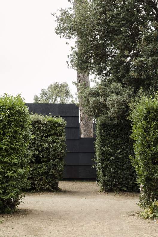 “PAN-ORAMA” is a pavilion designed for the 4th edition of the Festival des Cabanes at the Villa Medici. The project consists of a square enclosure space containing a centuries-old pine tree, which divides the area into two distinct zones: an inner space – more private and conducive to contemplation – facing the tree and the sky; and an outer space that echoes the distinctive hedge landscape of the Villa Medici gardens.