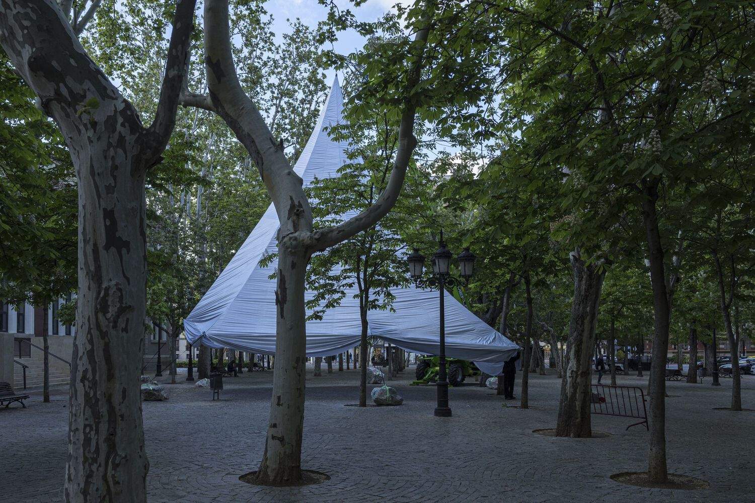 This mobile tensile structure is characterized by its lightness, which contrasts sharply with the solemn majesty of its surroundings. It is constructed entirely of installations and alternative building materials that can be found on the street.
