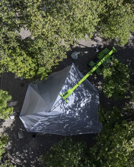 “扩音展馆”(The Megaphone Pavilion)是 “SCENIUS 26003” 方案的一个典型实践,它代表着一种动态的建筑理念。该展馆由一个十五米高的定制针织张拉结构搭建而成,固定在一台租赁起重机的单一安装点上,起重机的吊臂高高耸立在周围树木之上,同时,七块当地采集的石头界定了展馆所连接的一个现有空地的边界,而织物就附着在这个边界上。