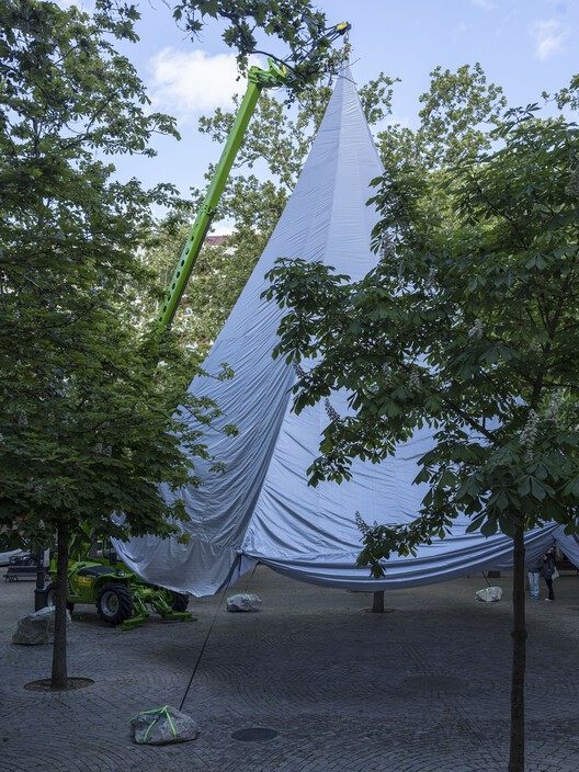 这种可移动的张拉结构以其轻盈为特点,与周围环境的庄重宏伟形成了鲜明对比。它完全采用我们在街头就能找到的装置和替代性建筑材料构建而成。