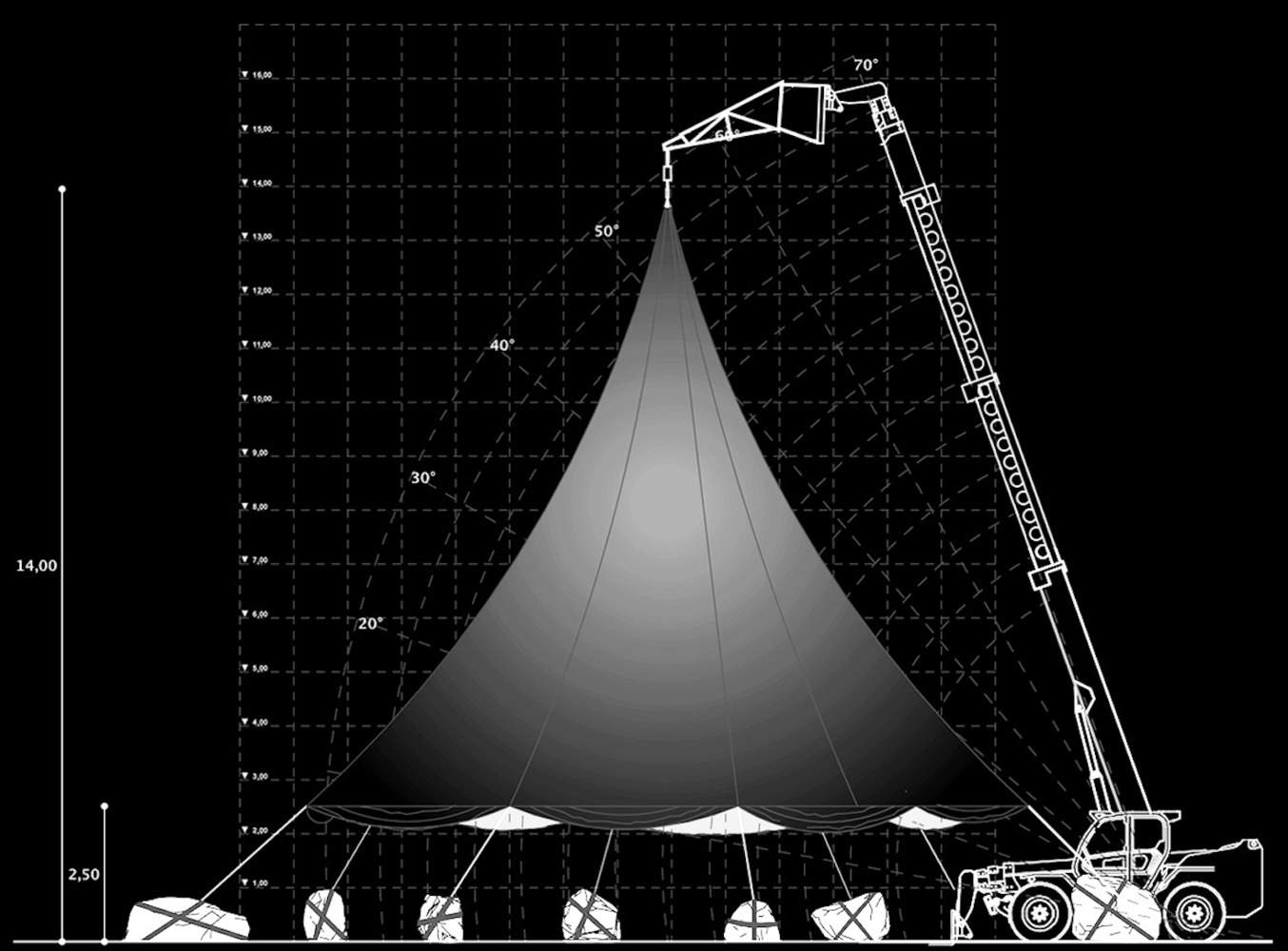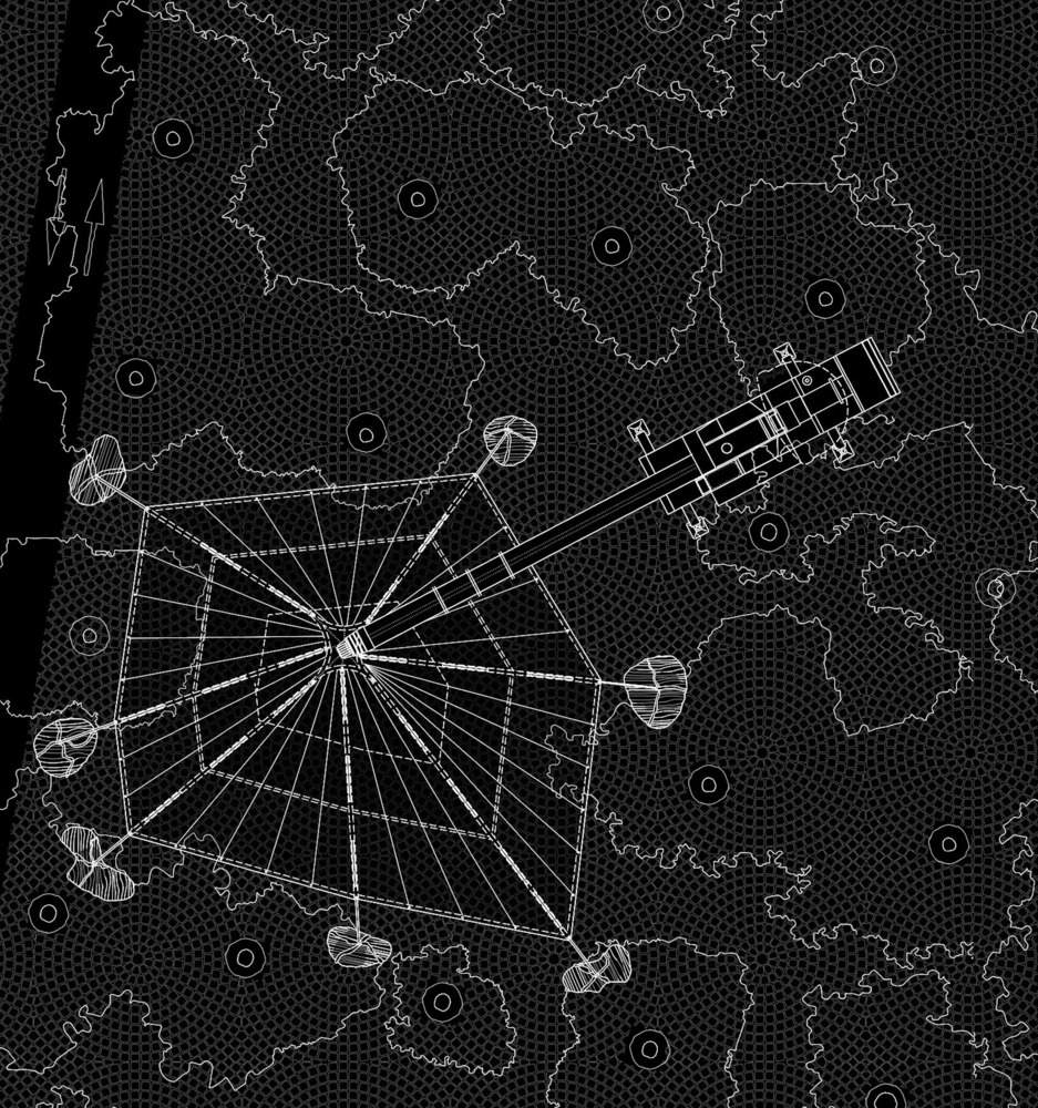The “Megaphone Pavilion,” a typical implementation of “SCENIUS 26003,” represents a dynamic architectural concept. The pavilion is constructed from a fifteen-meter-high custom-knitted tensile structure, anchored at a single installation point on a rented crane whose boom rises high above the surrounding trees. Meanwhile, seven locally sourced stones define the boundary of an existing clearing to which the pavilion connects, with the fabric attached to this boundary.