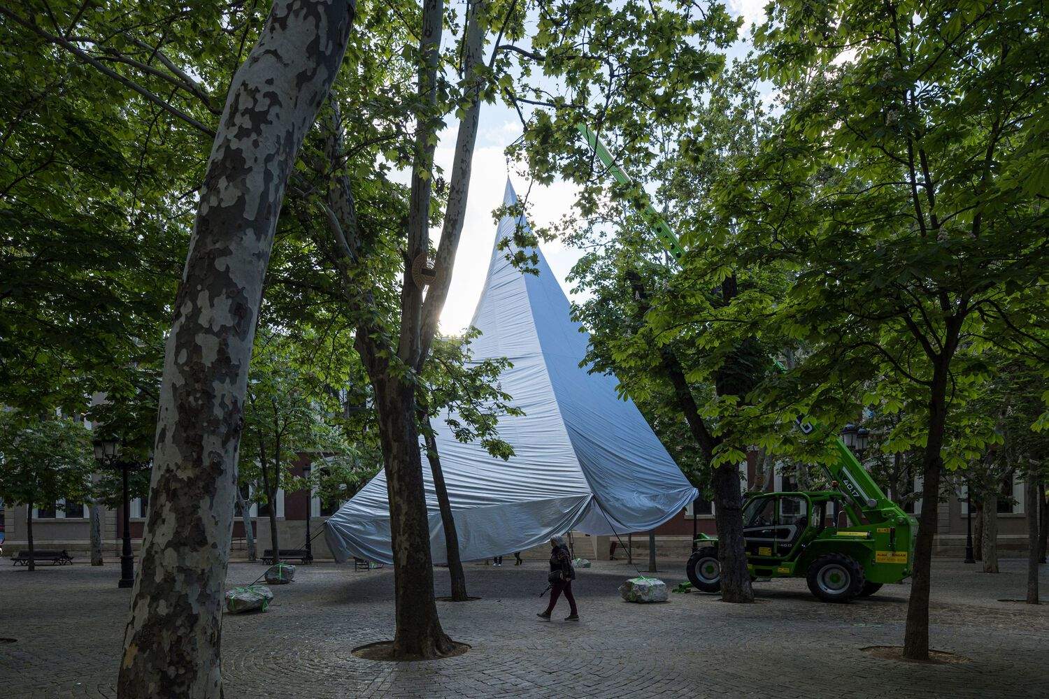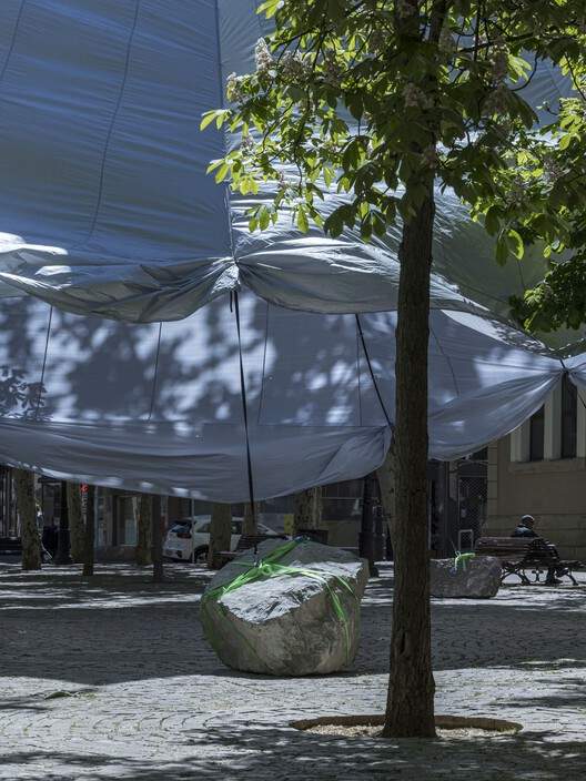 设计师并未将展馆视为一个固定物体,而是将其视为一个具有响应性的膜结构 —— 一个在建筑、气候和集体活动之间起到调和作用的大气装置。这个大型张拉结构由一台租赁的起重机悬挂,并由八块当地采集的岩石锚定,这些岩石位于洛格罗尼奥的城市森林中。
