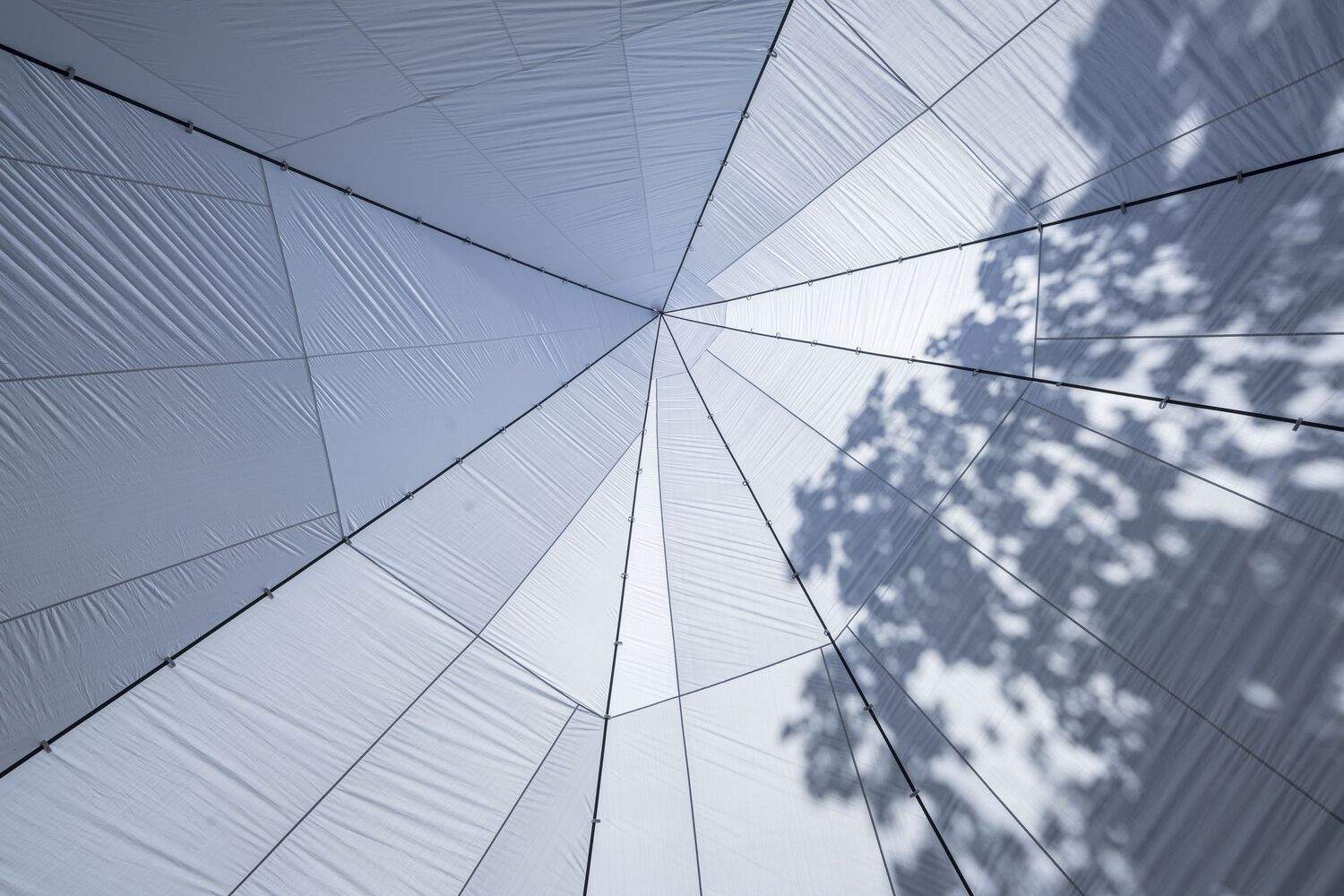 织物的材质特性 —— 其飘动、透气和反光的能力 —— 与风、阳光以及聚集在其下方的人群形成了动态的关系。