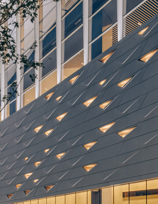 飞檐意象的当代演绎与“群鸟”的动态美学:设计精髓在于对中国传统“飞檐”的创新转化,以内凹弧线和向上卷翘的屋檐,表达了庇荫与欢迎的场所精神。立面则以参数化设计的菱形搪瓷钢板和三角形开窗,构筑了壮观的“飞鸟画卷”浮雕,这种动感美学不仅赋予建筑独特的身份标识,也巧妙地解决了采光、遮阳和材料的耐久性要求,将东方审美与严苛的工程实现完美结合。