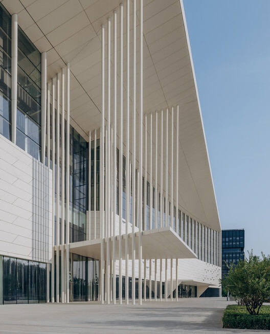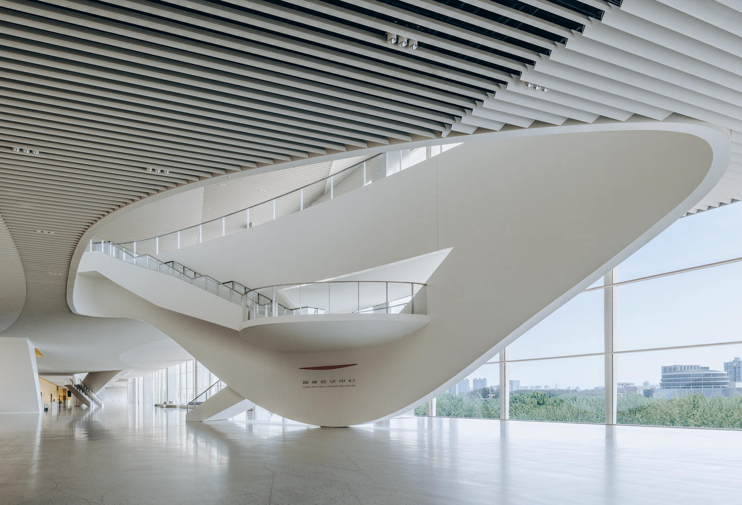 The main facade of the National Convention Center Phase II can be seen as a contemporary transformation of the traditional Chinese "flying eaves." Through concave curved facades and a simple, sloped geometric intersection, a horizontal eave running north-south is formed, under which the main facade gently recedes with an inward curve. The structural tension between the eaves and the facade causes both ends to curl slightly upwards, converging into a visual focal point. It symbolizes upward aspiration and progress, and also acts like a slowly unfolding invitation to greet guests. Portzamparc views the flying eaves as an architectural language expressing the spirit of Chinese place: protection and welcome, conveying the spirit of a gathering place. As he said, "There are few straight lines in traditional Chinese architecture. The curve at the entrance is like a shading eave, extending towards the sky, which is the philosophy of space."
