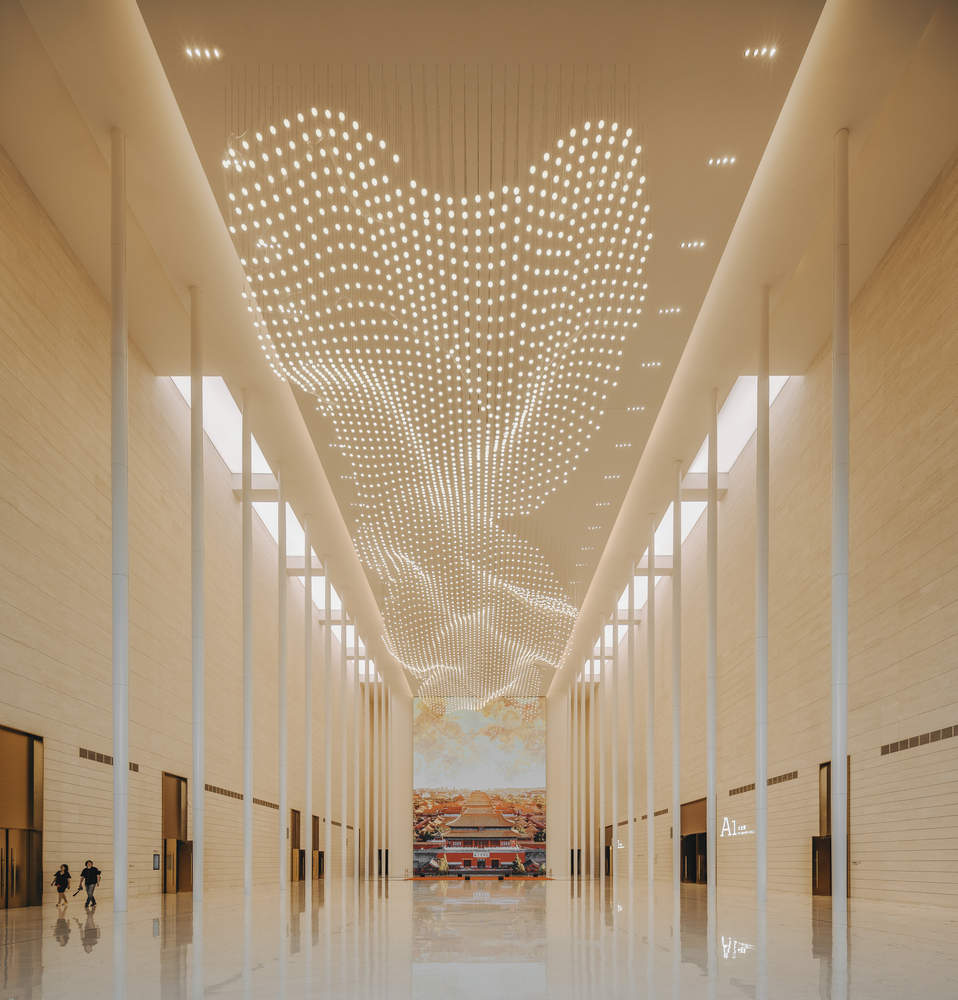 Within the light and transparent east facade, a 36-meter-high VIP entrance is specially set, resembling a drawn-back curtain. The entrance is located at the intersection of two curved walls, flanked by 12 colonnades that gradually converge inward, guiding the sightline to focus on the central full-height entrance. The entrance canopy is a 22-meter large cantilever, beneath which is an 8.5-meter high, 3-meter wide automatic sliding door—a challenge to structural limits that results in a solemn, reserved, and grand entrance space. Upon entering, one finds the 26-meter high "Welcome and Photo Hall," where 26 slender white decorative columns line both sides leading to a giant LED screen mural at the end. Hundreds of custom teardrop-shaped LED lights on the ceiling are arranged like flying birds, rippling like shimmering water, unfolding a flowing prelude of light and shadow between heaven and earth.