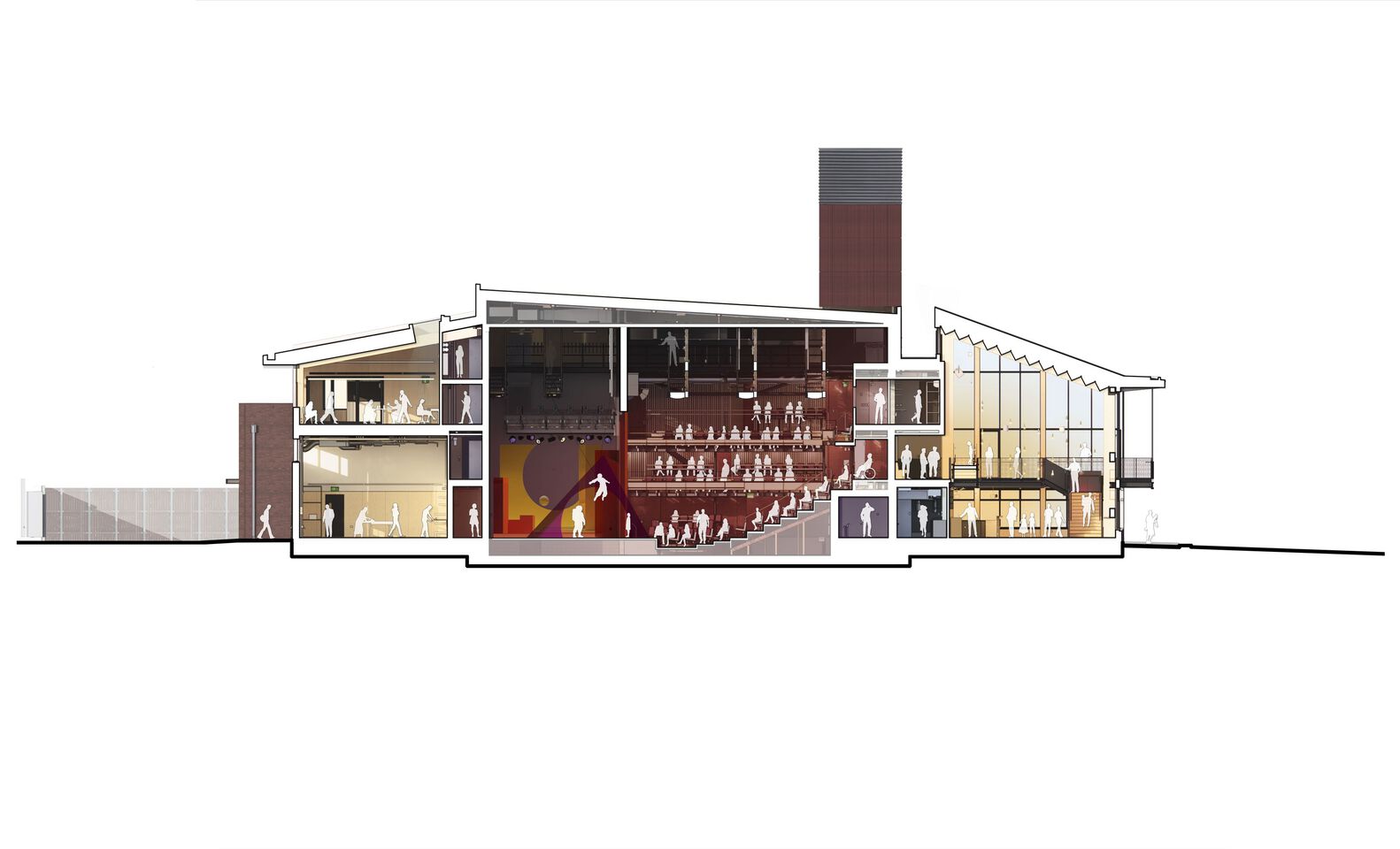 5. Accessible Circulation – The building provides universal accessibility. Specifically within the auditorium, level access is provided across all tiers for wheelchair seating, minimising level changes and incorporating wayfinding features for ease of navigation. Material choices also consider legibility.