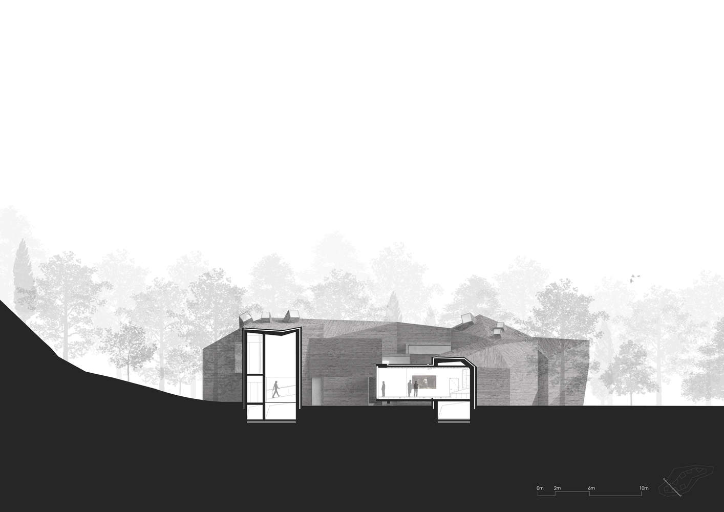 The plan of the building originates from a central courtyard, with the layout naturally conforming to the site boundaries, forming a linear circulation within the exhibition spaces.
