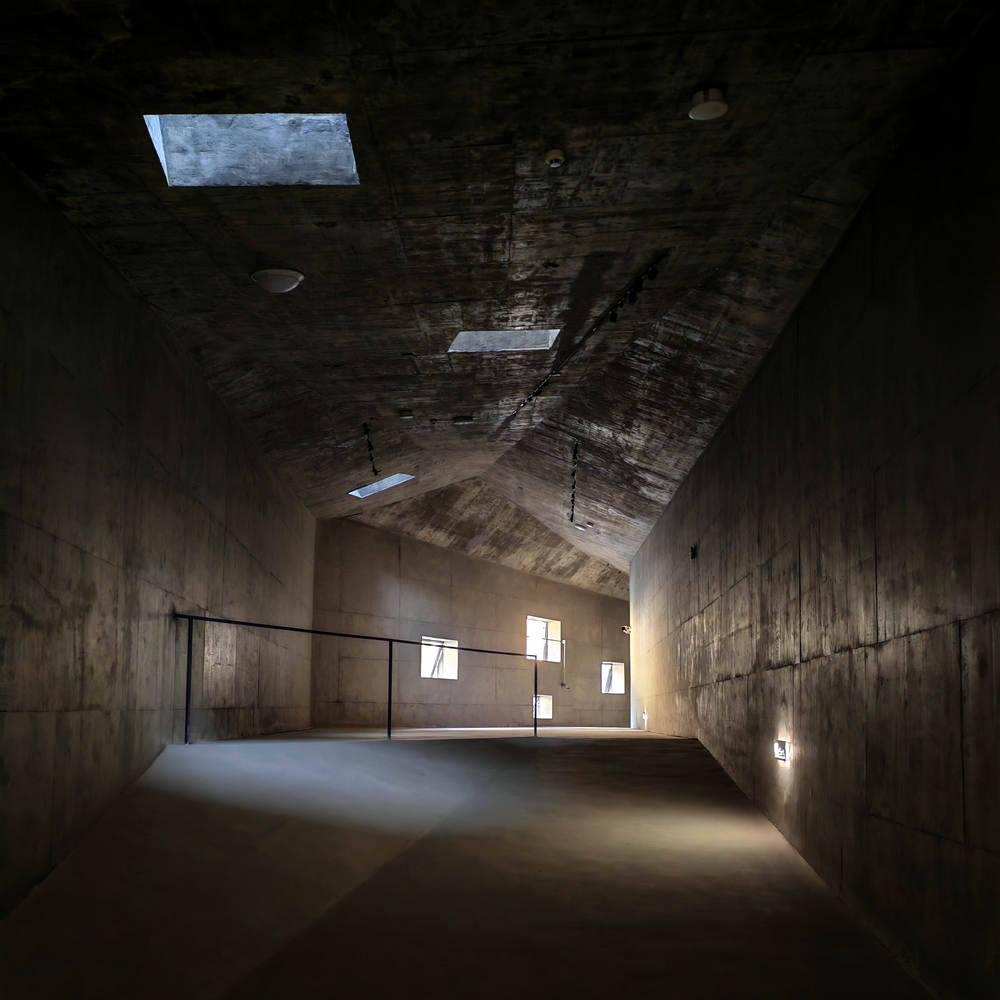 The main body of the building is cast-in-place concrete mixed with black ink. Under the combined effect of natural and artificial lighting, the material unity and the sculpturally varied form create a distinct and vivid contrast with the surrounding natural environment.