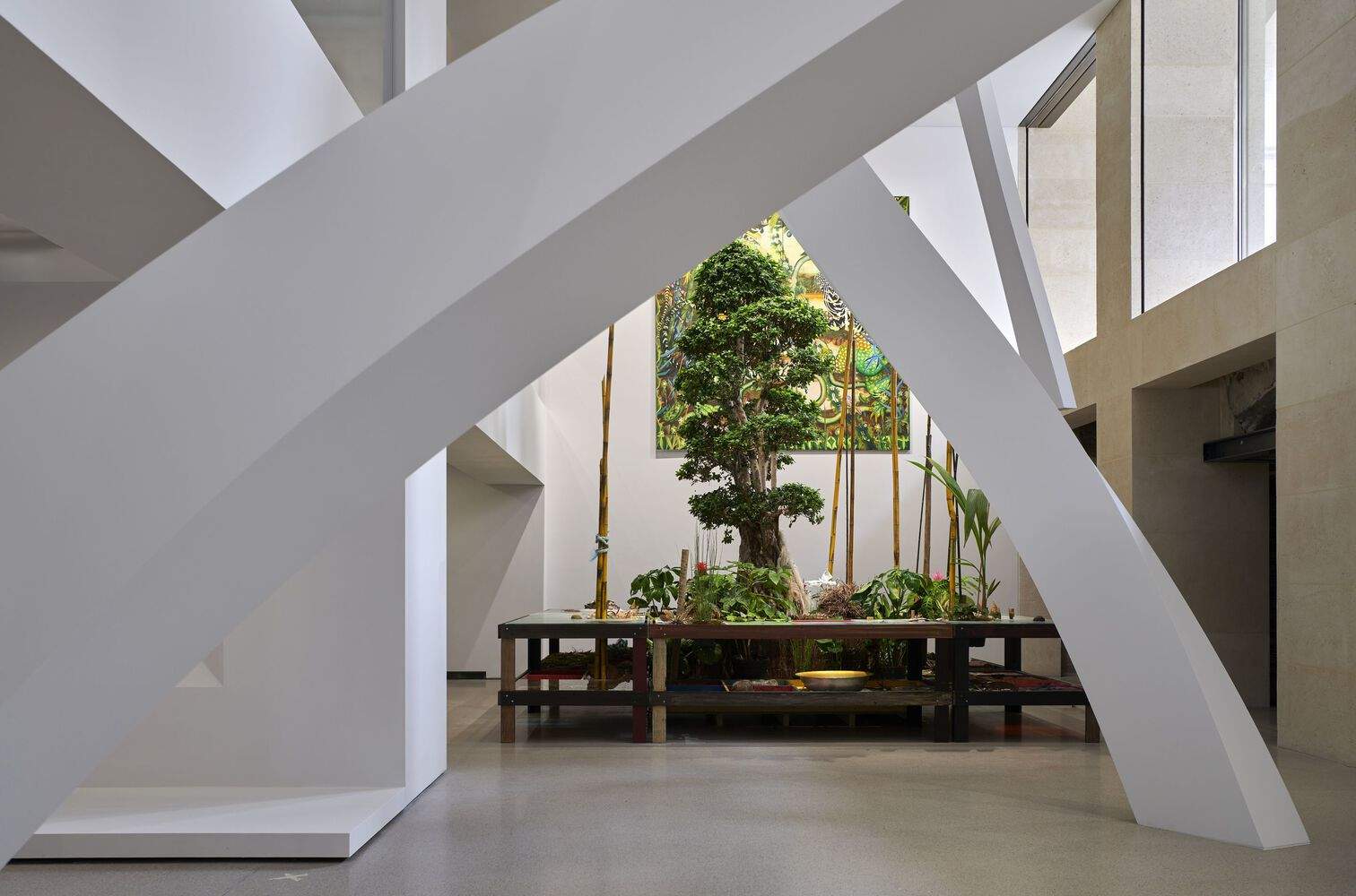 *Exposition Générale*的各个部分在让·努维尔建筑的机械灵活性中展开。“建筑机器”将第一个平台变成了一个“城市实验室”,从Alessandro Mendini的《微型大教堂》到Freddy Mamani生动的《活动沙龙(Salón de eventos)》,富有远见的设计和乌托邦式的模型将城市重新想象为一个变革的场所。“自然”单元将焦点转移到现实世界,将室内空间转变为一个感官生态系统,Solange Pessoa的羽毛装置悬停在Claudia Andujar, Giuseppe Penone和Bernie Krause的作品上方。“制造事物”(Making Things)单元追溯工艺、设计和美术之间流动的界限,而“现实世界”(Un monde réel)单元则通过沉浸式作品探索科学、技术和虚构的交汇,例如Sarah Sze的《追踪坠落的天空(Tracing Falling Sky)》和Diller Scofidio + Renfro的数据驱动型《出口(EXIT)》。