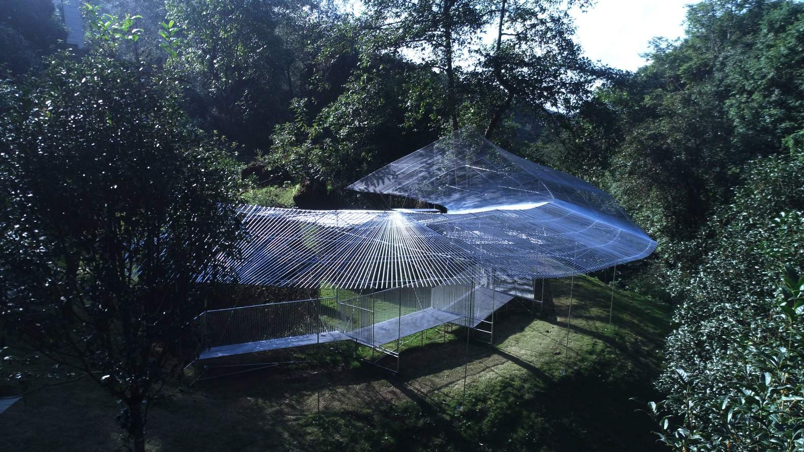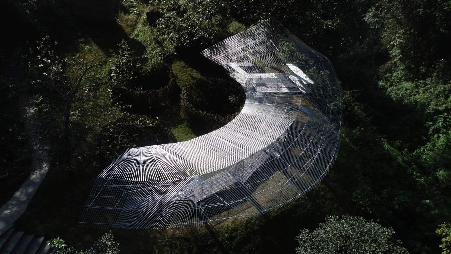 场地精神的精准捕捉与诗意转译:该项目最精髓之处在于,建筑师从场地中偶然发现的白鹇羽毛中汲取灵感,将自然物象精准地转译为建筑语言。通过14毫米的纤细镀锌钢筋编织出双曲下垂的弧顶,完美模拟了羽毛的优雅形态与轻盈质感。这种对“形”的捕捉不仅是对自然现象的致敬,更通过结构上的“轻触大地”和东侧的轻盈支撑,实现了建筑在林间“悬浮”的诗意效果,创造了极强的视觉张力和场所精神。
