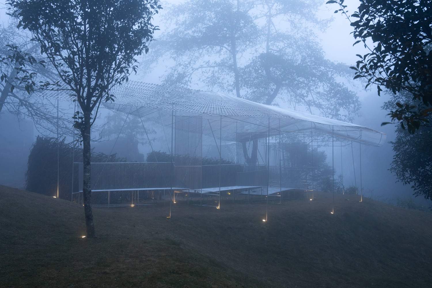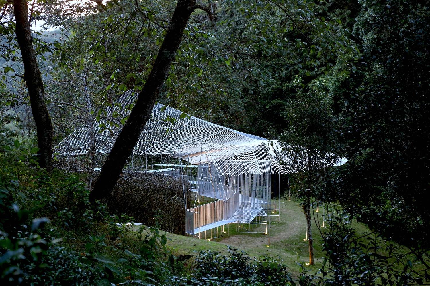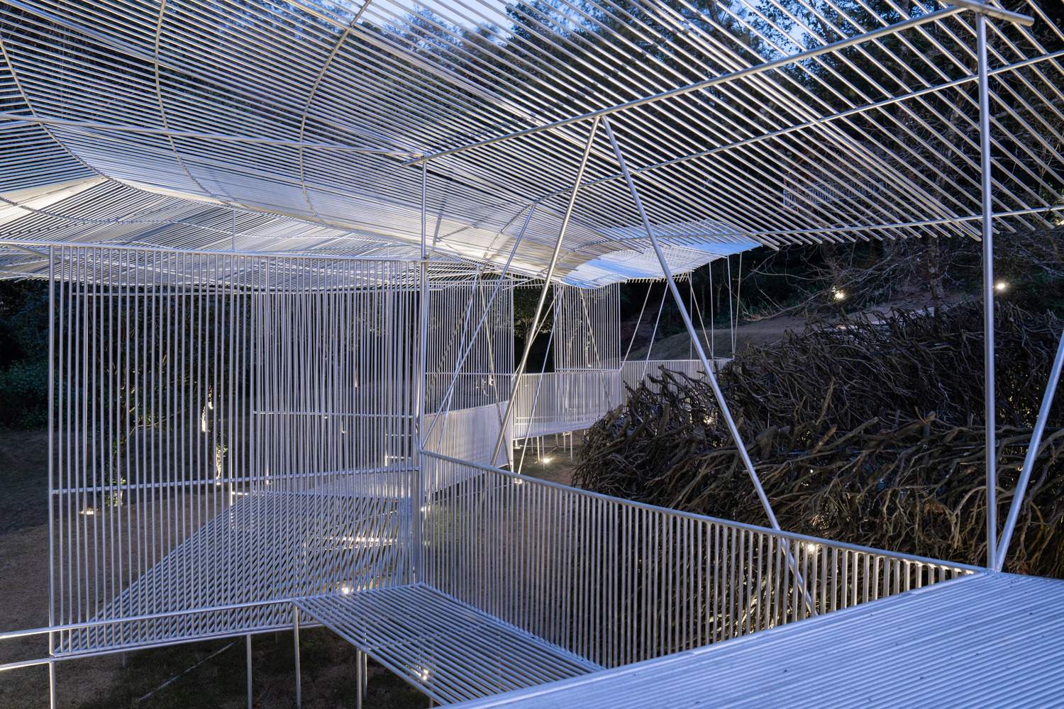 变幻的羽衣:镀锌钢筋表面施以银色金属漆,成为记录天光的画布。雾霭中泛出清冷的蓝调,夕照时晕染浪漫的紫霞,暗夜被暖黄灯光浸透后,在墨绿色的丛林中涌现暖意。