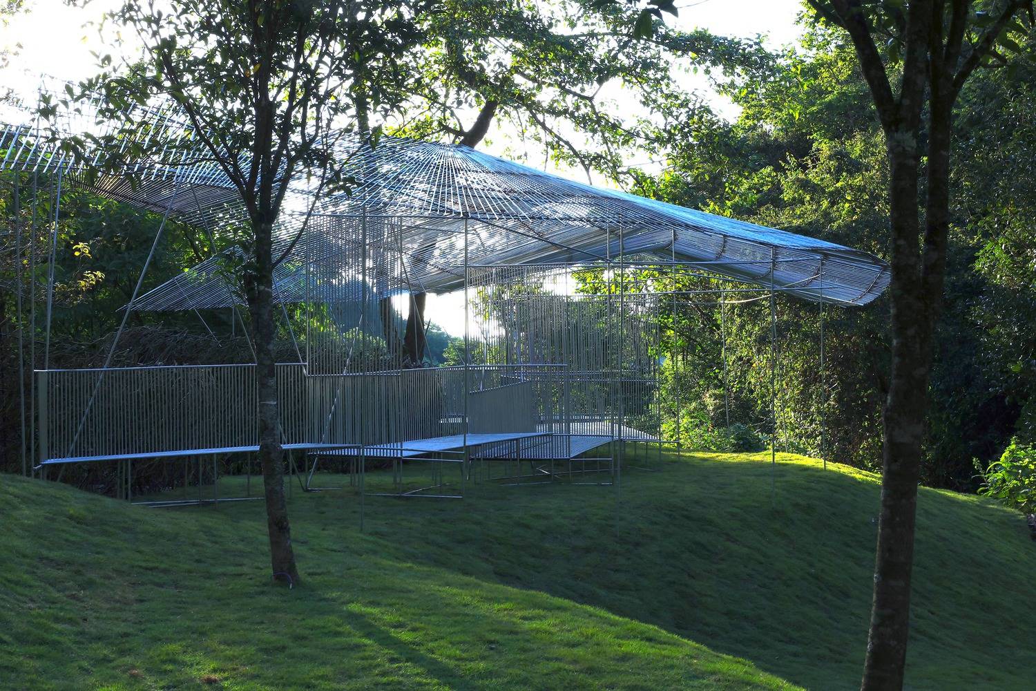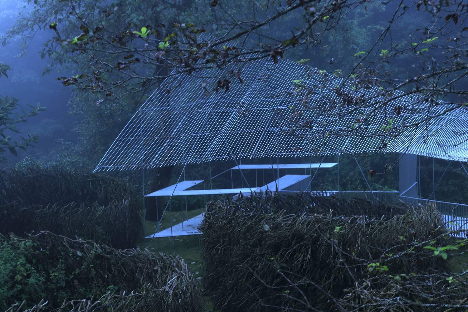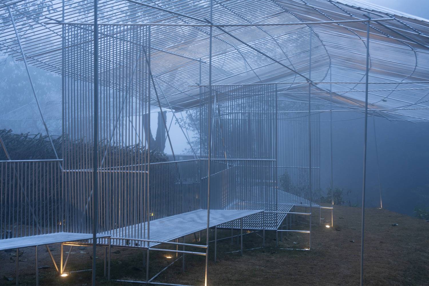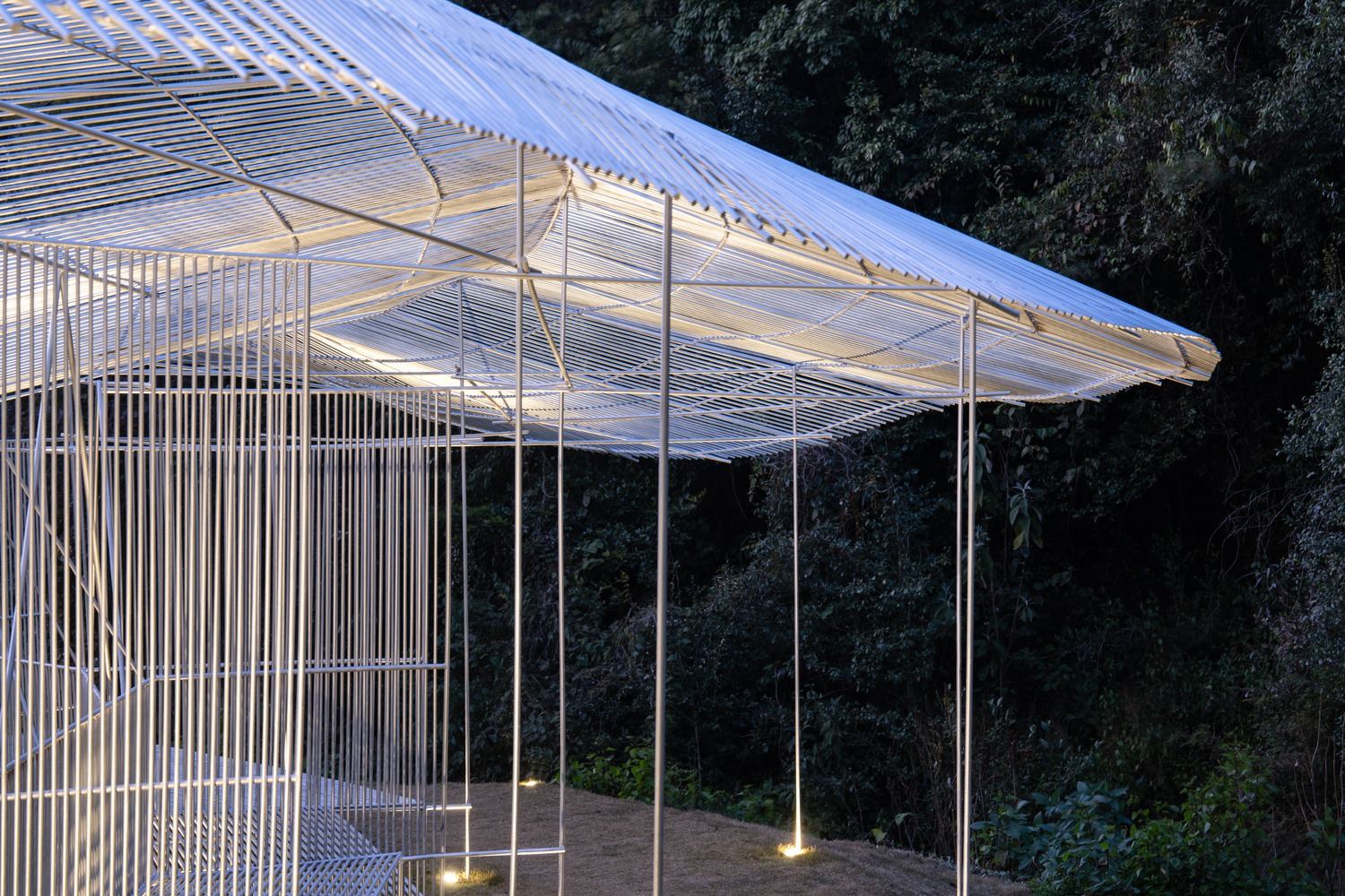 The Shifting Plumage: The surface of the galvanized steel bars is coated with silver metallic paint, becoming a canvas for recording the light of the sky. It shows a cool blue tone in the mist, is tinged with romantic purple clouds at sunset, and exudes warmth in the dark night when permeated by warm yellow light, emerging from the dark green jungle.