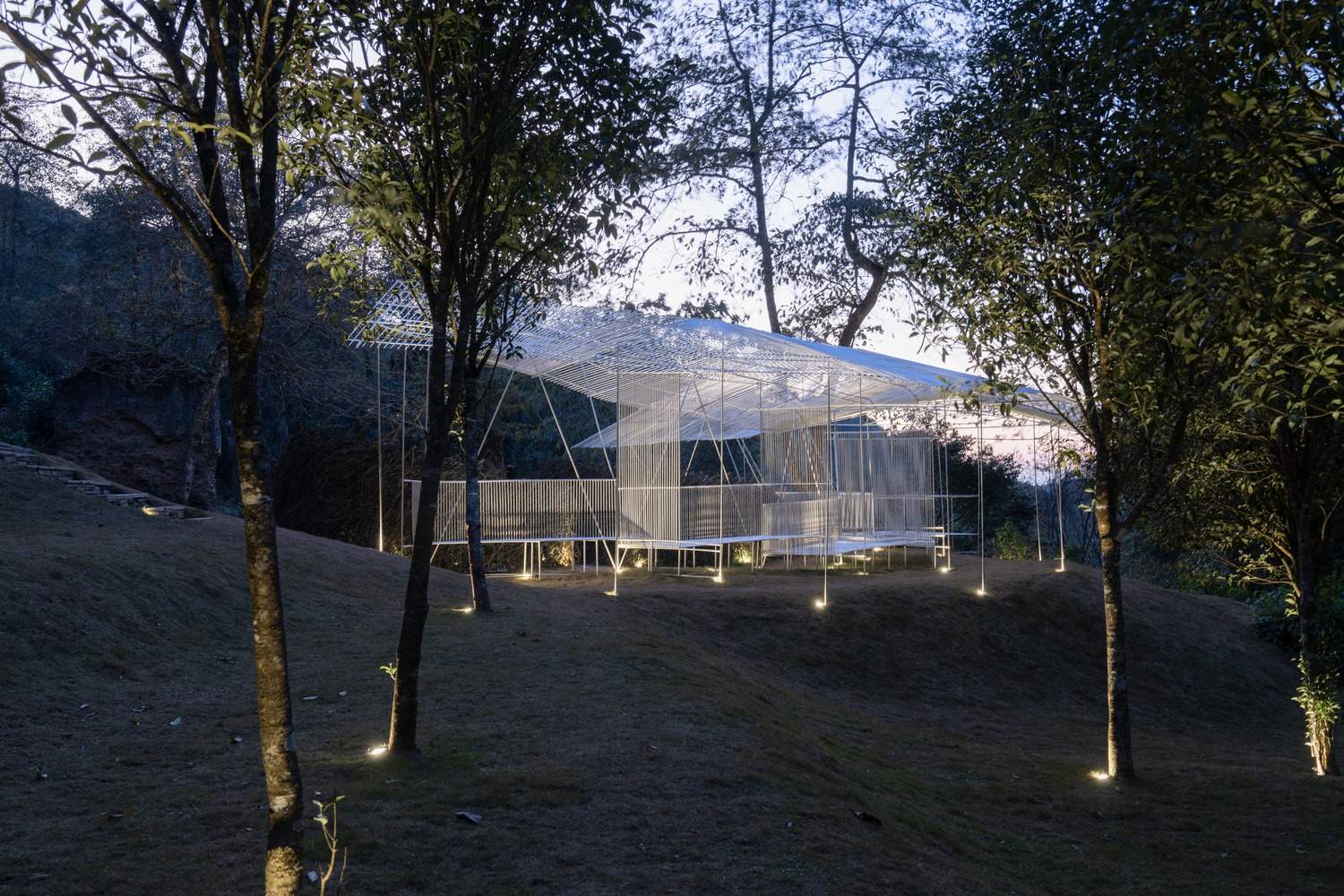 The Translation of Feathers: The designer used the language of "light touch on the earth," employing galvanized steel bars instead of ink to sketch lines among ancient trees and valleys. The 14mm slender galvanized steel bars simulate the long legs of the white pheasant, growing upwards from the ground, weaving a hyperboloid drooping arc in the air to capture the elegant curve of a feather. The tea couch and bar on the south side form the gravity anchor points, while the east side is lightly supported by only a few steel bars, making the building resemble a silver feather about to fall, creating an overall sense of "suspension."