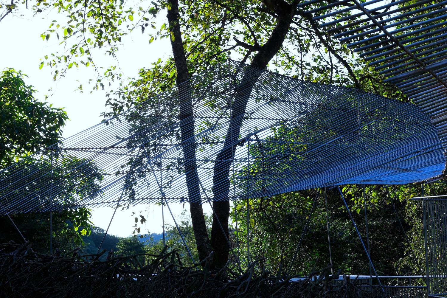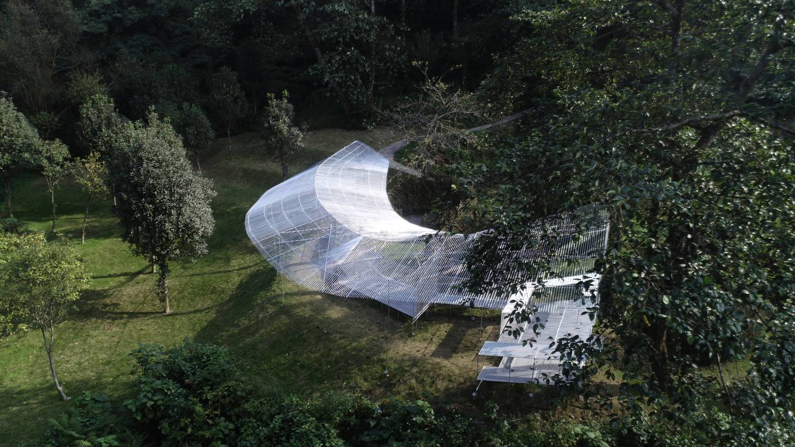 羽毛的转译:设计者以“轻触大地”的语言,用镀锌钢筋代替笔墨,在古树与山谷中勾勒线条。14 毫米纤细的镀锌钢筋模拟白鹇修长的足胫,从地面向上生长,在空中编织出双曲下垂的弧顶,捕捉羽毛的优雅弧度。南侧茶榻与吧台形成重力锚点,东侧仅凭数根钢筋轻盈支撑,令建筑宛若一片将落未落的银羽,营造整体 “悬浮”感。