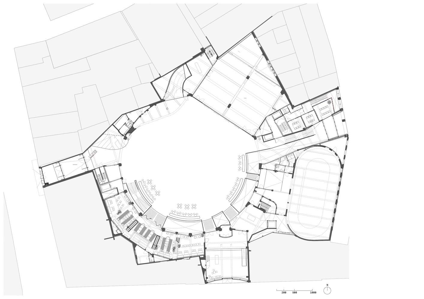 冬季马戏团的历史——冬季马戏团大楼始建于 1885 年,根特市按照建筑师埃米尔·德·维尔特(Emile De Weerdt)的规划建造了这座“新马戏团”。当时,多个马戏团在此演出,甚至在冬季也不例外,因此民众开始用“冬季马戏团”这个名字来称呼这座建筑。1920 年,该建筑几乎被大火完全烧毁,三年后得以重建。第二次世界大战后,吉斯兰·马希(Ghislain Mahy)将其改用作汽车修理厂。建筑进行了彻底改造,原有的马戏团风格内部装饰荡然无存。这家修理厂一直运营到 1978 年,此后冬季马戏团被用作经典汽车存放地。2005 年,根特市的一群城市开发商 —— Sogent 集团收购了这座建筑,计划对其进行翻新改造并重新规划用途,将其融入新的德克鲁克(De Krook)城市街区。建筑结构翻新工程由 BARO 和 SUMproject 两家建筑设计公司负责设计。2009 年,根特市被联合国教科文组织认定为音乐创意城市。2018 年,根特市承诺到 2050 年实现气候中和。2020 年,TENT 公司租下了冬季马戏团,租期为 75 年。