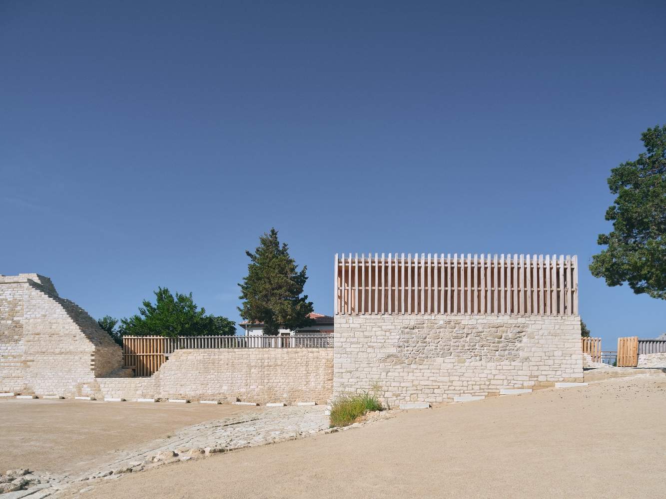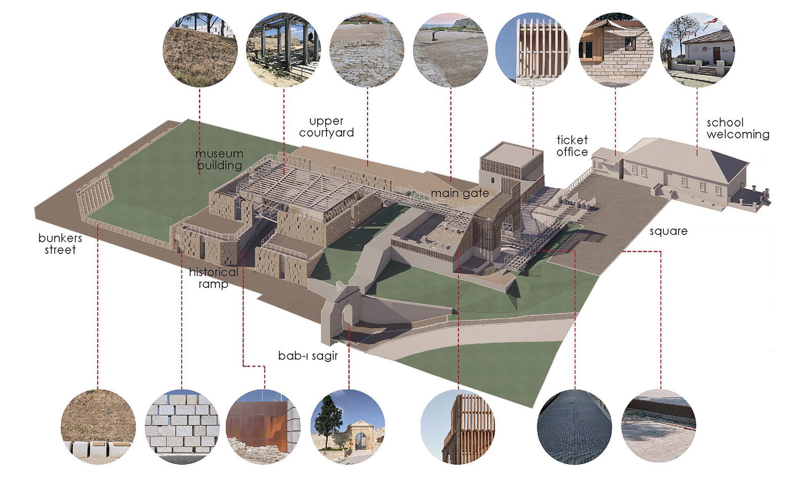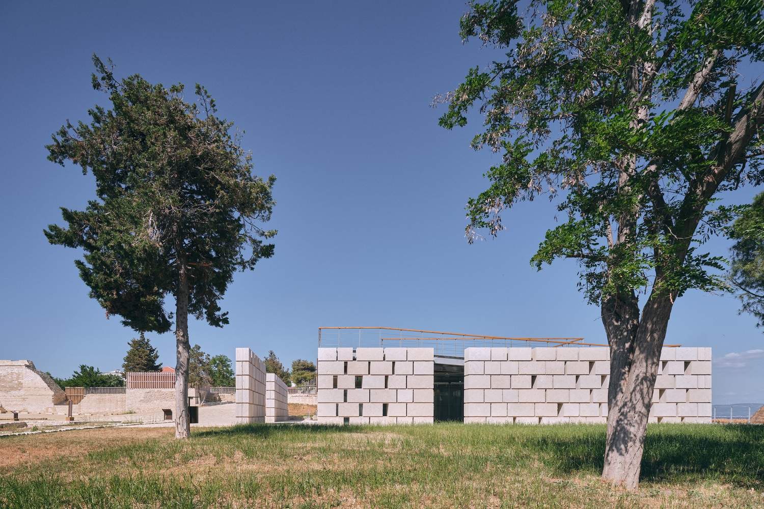 A new museum building has replaced the concrete barracks abandoned in the 1960s, exhibiting archaeological finds from the site, including an Ottoman-era road that runs through the museum building itself. Here, the newly constructed masonry walls echo the original masonry techniques of the Ottoman city walls, effectively reducing the visual impact of the new building on the historical landscape.