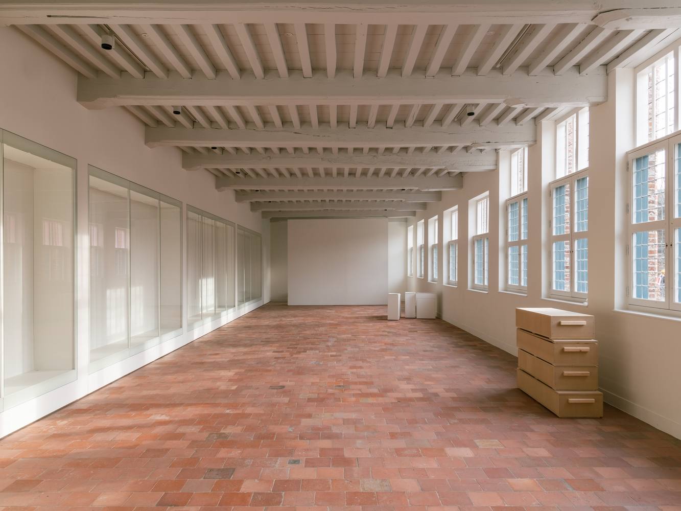 The interventions in the original dormitory building were minimal, involving only the restoration of the original windows, ceilings, and the red terracotta floor. Additionally, a long display case was added to exhibit artworks from Kortrijk, inviting interaction between artists and the collection.